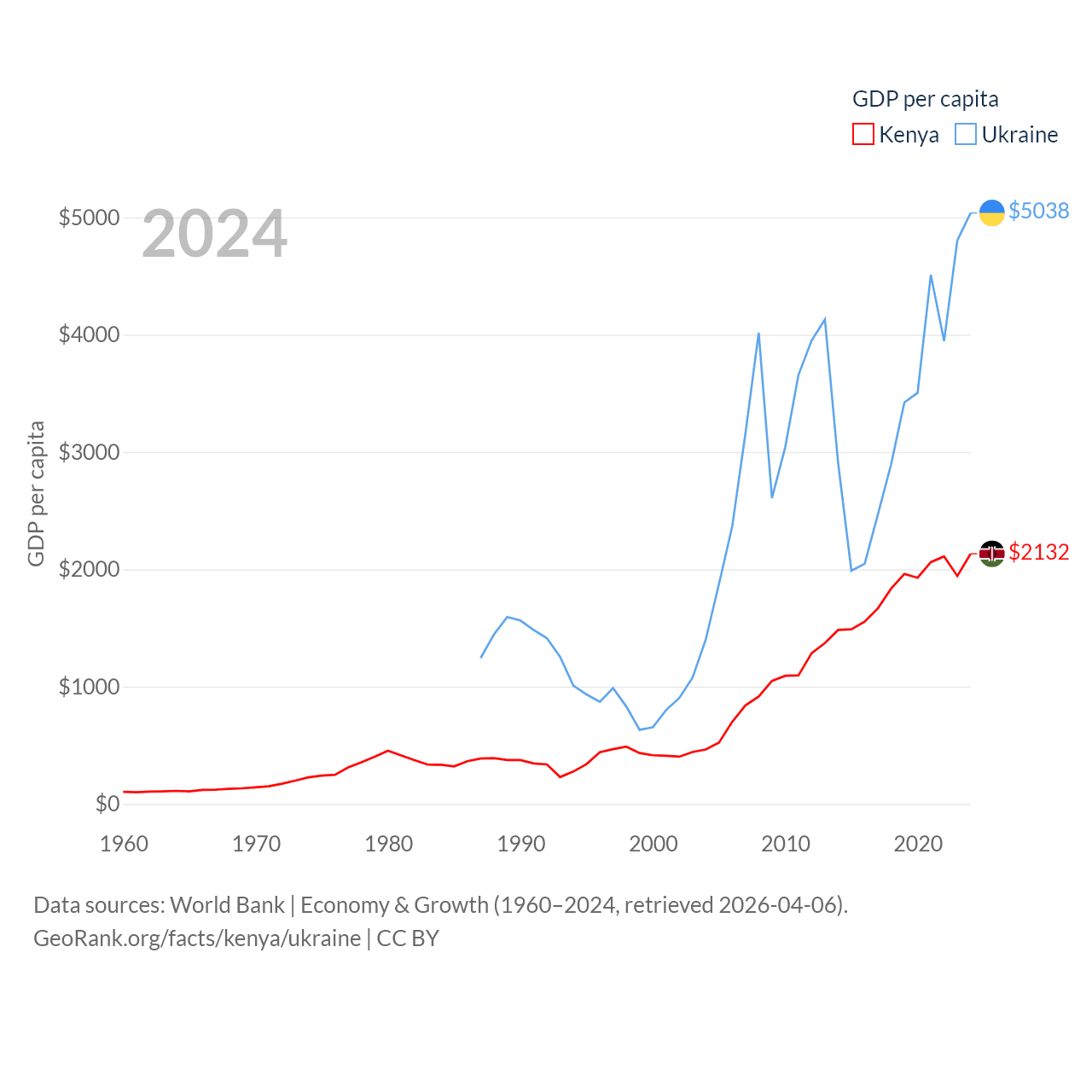 By GDP, Kenya ranks 64/197 ($120B) and Ukraine ranks 57/197 ($191B). By GDP per capita, Kenya ranks 154/197 ($2,132), while Ukraine ranks 120/197 ($5,038).