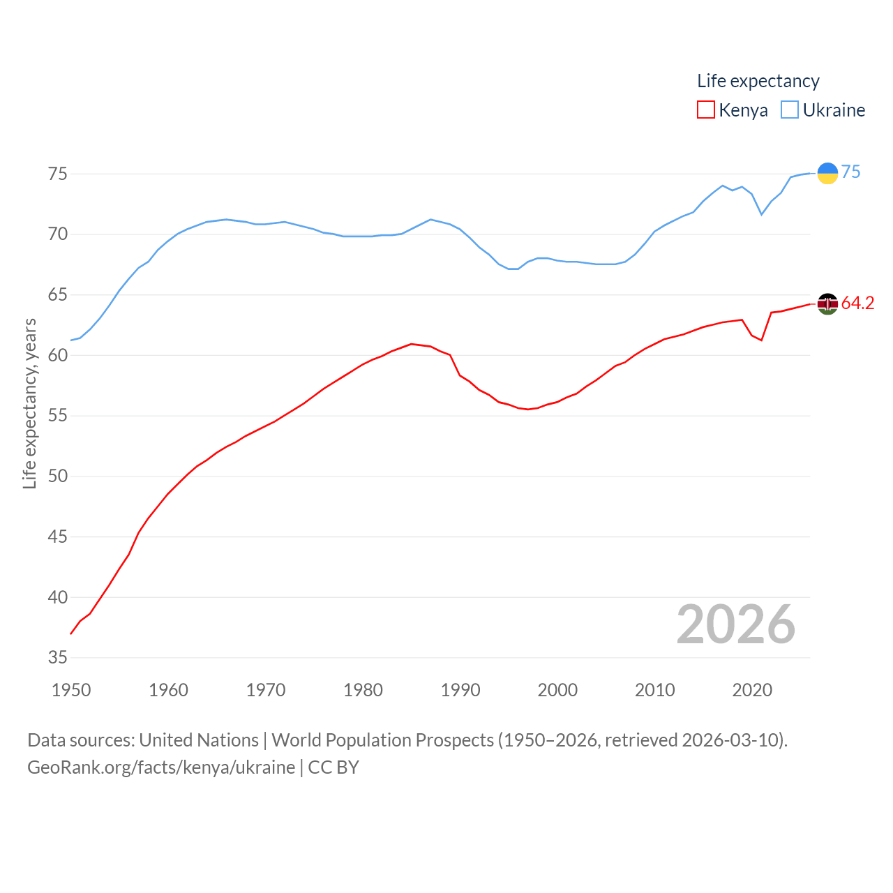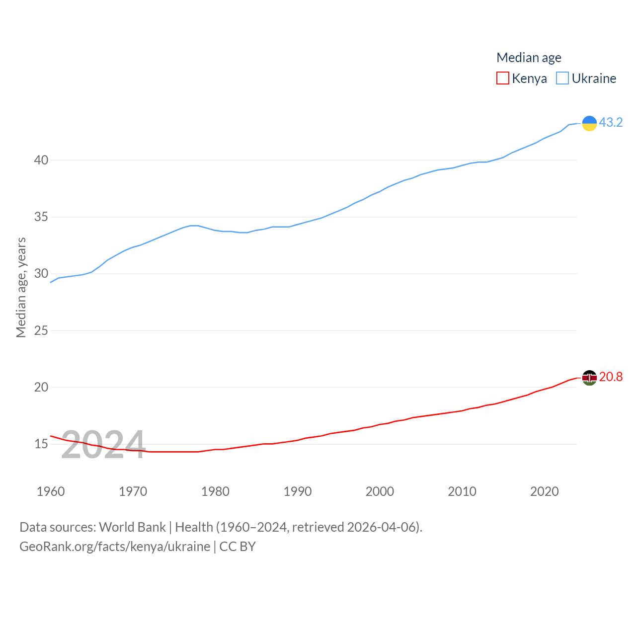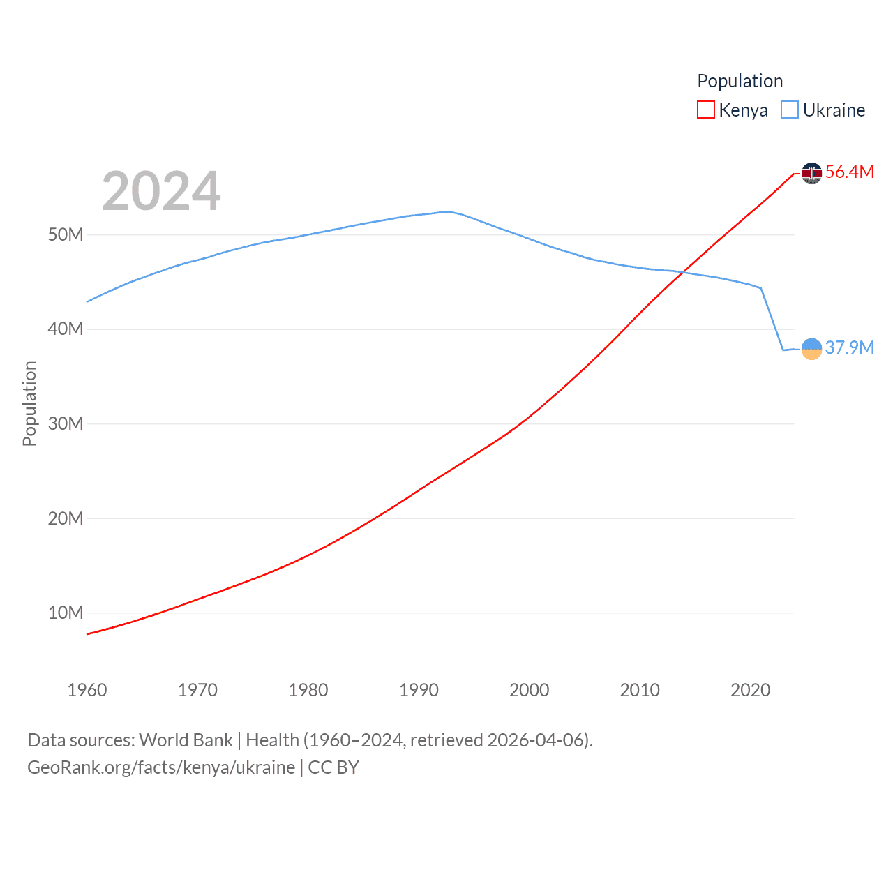 Kenya has a population of 56.4M (ranked 26/197), compared with 37.9M in Ukraine (ranked 41/197). Kenya's land area is 224,278 sq mi versus 223,708 sq mi for Ukraine (ranked 45th vs. 46th).