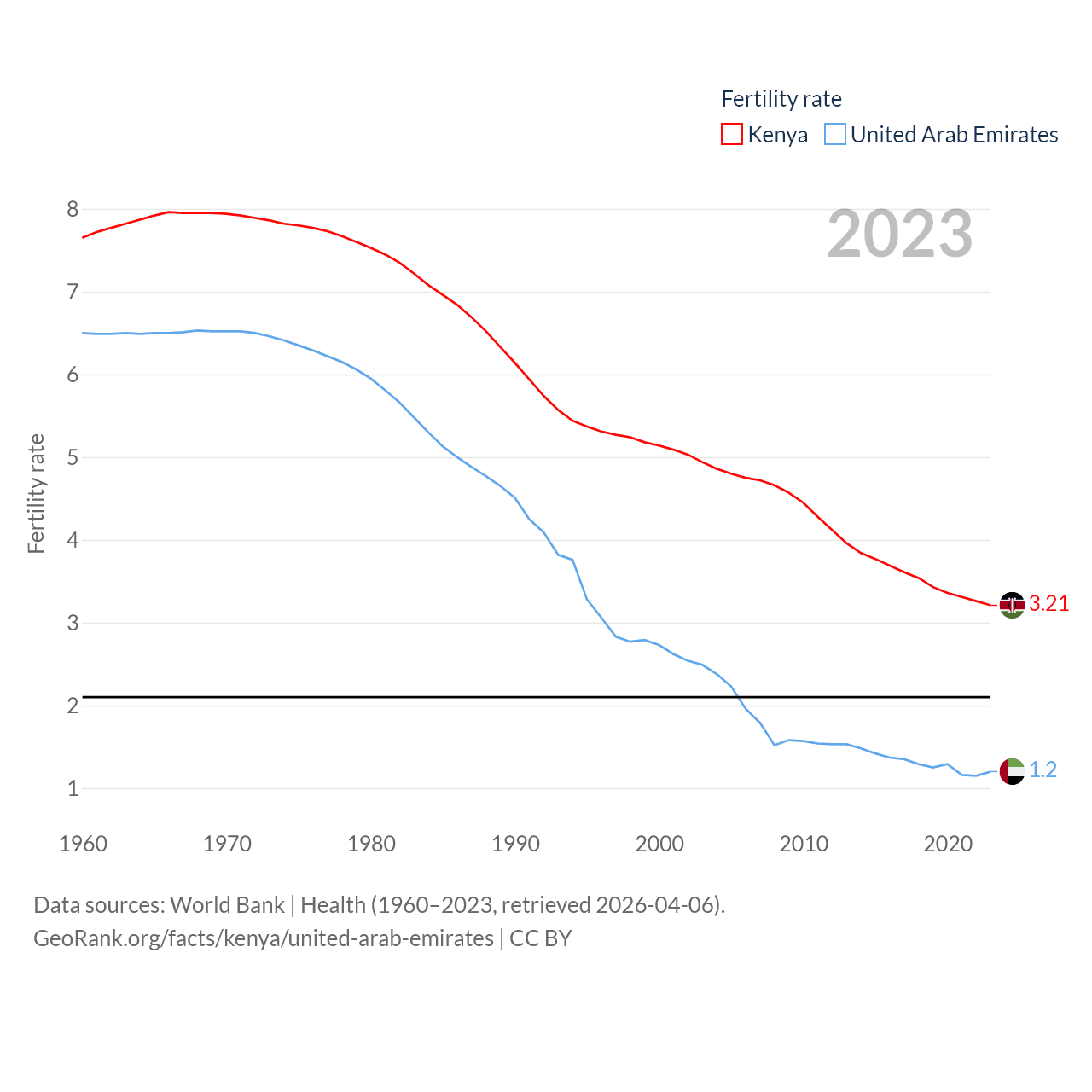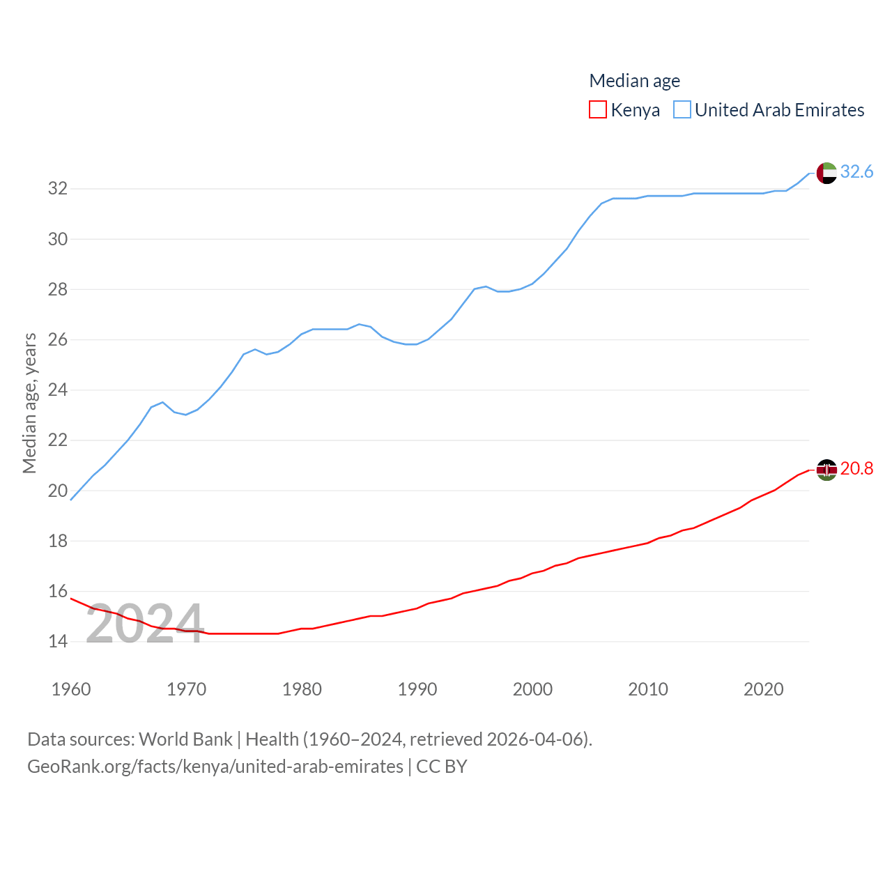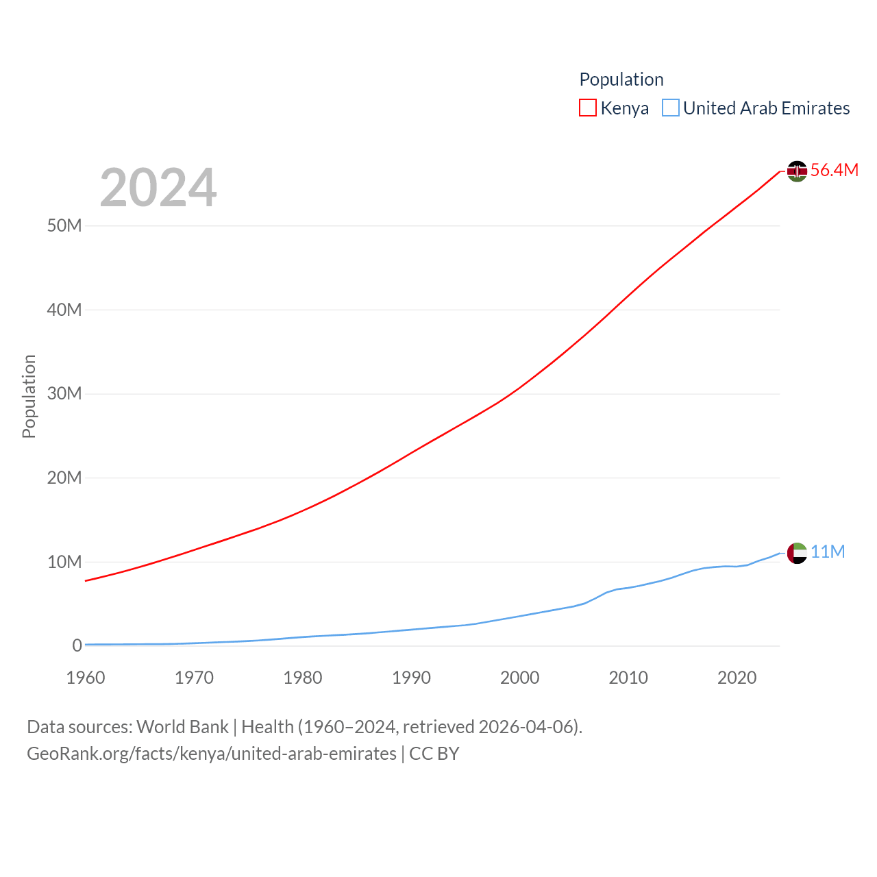 Kenya has a population of 56.4M (ranked 26/197), compared with 11M in The United Arab Emirates (ranked 86/197). Kenya's land area is 224,278 sq mi versus 27,421 sq mi for The United Arab Emirates (ranked 45th vs. 117th).