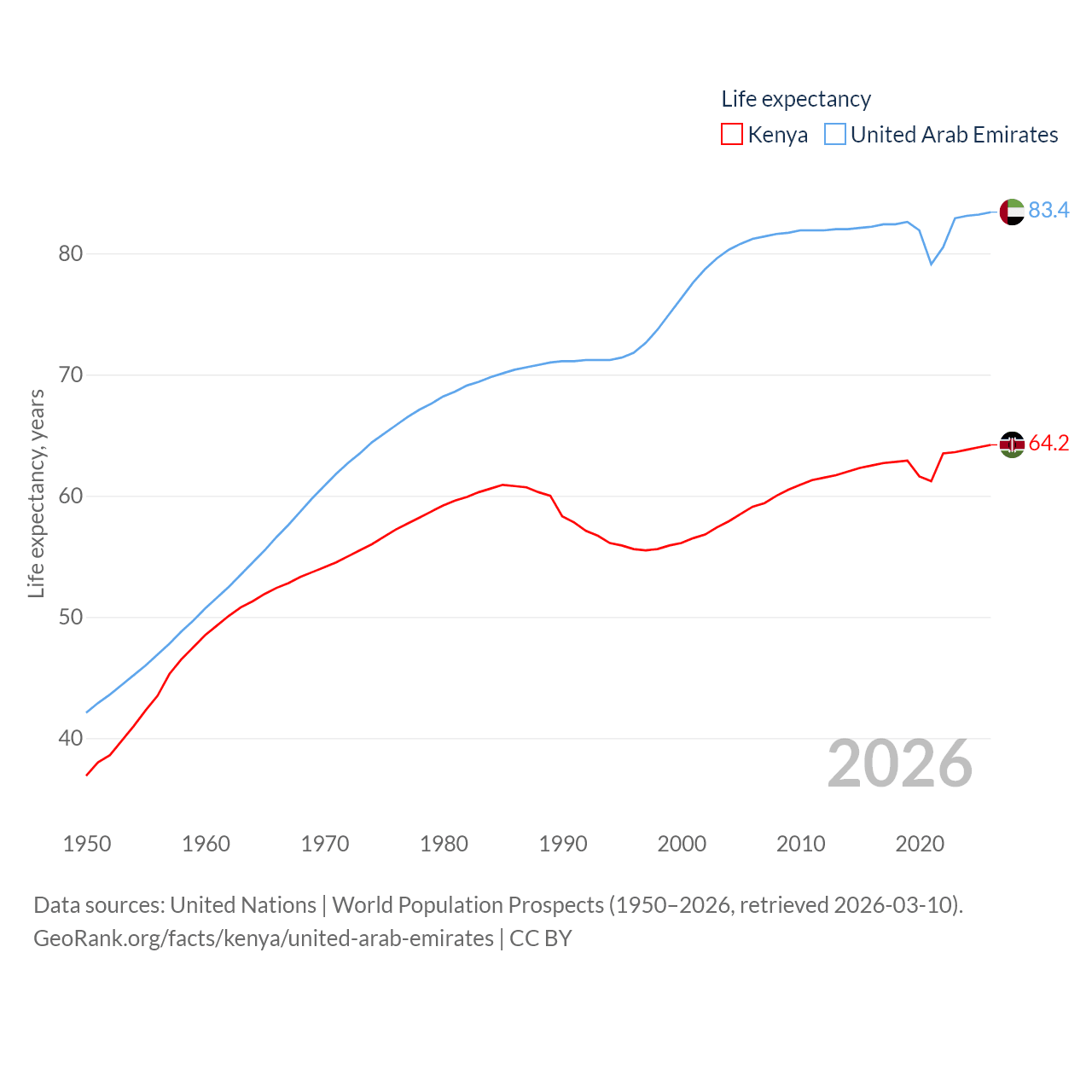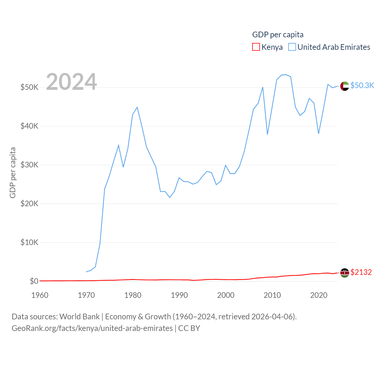 By GDP, Kenya ranks 64/197 ($120B) and The United Arab Emirates ranks 27/197 ($552B). By GDP per capita, Kenya ranks 154/197 ($2,132), while The United Arab Emirates ranks 24/197 ($50,274).