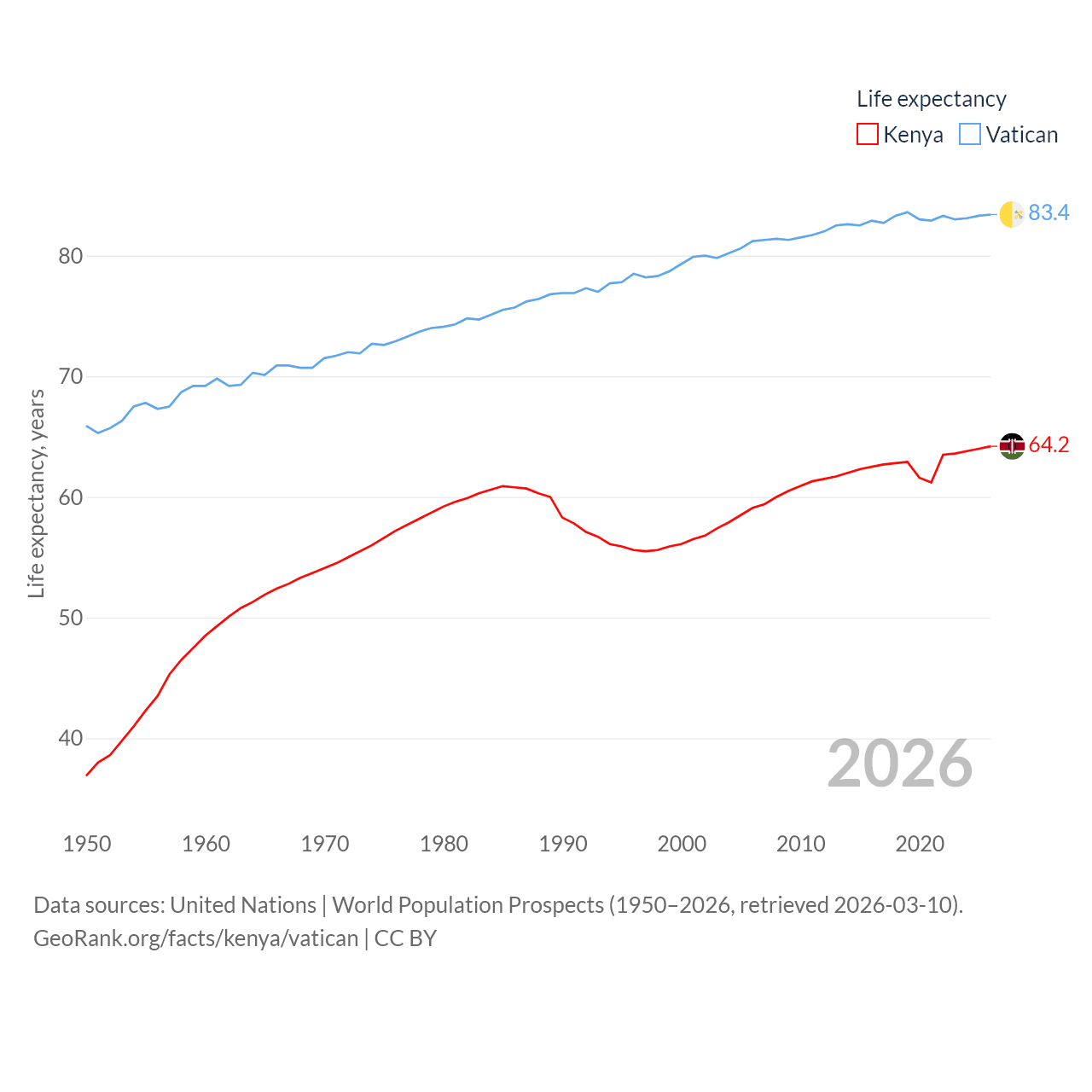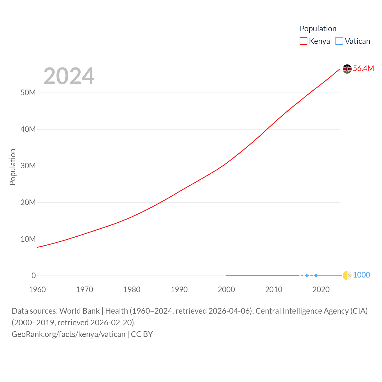 Kenya has a population of 56.4M (ranked 26/197), compared with 1K in The Vatican (ranked 197/197). Kenya's land area is 224,278 sq mi versus 0.17 sq mi for The Vatican (ranked 45th vs. 197th).
