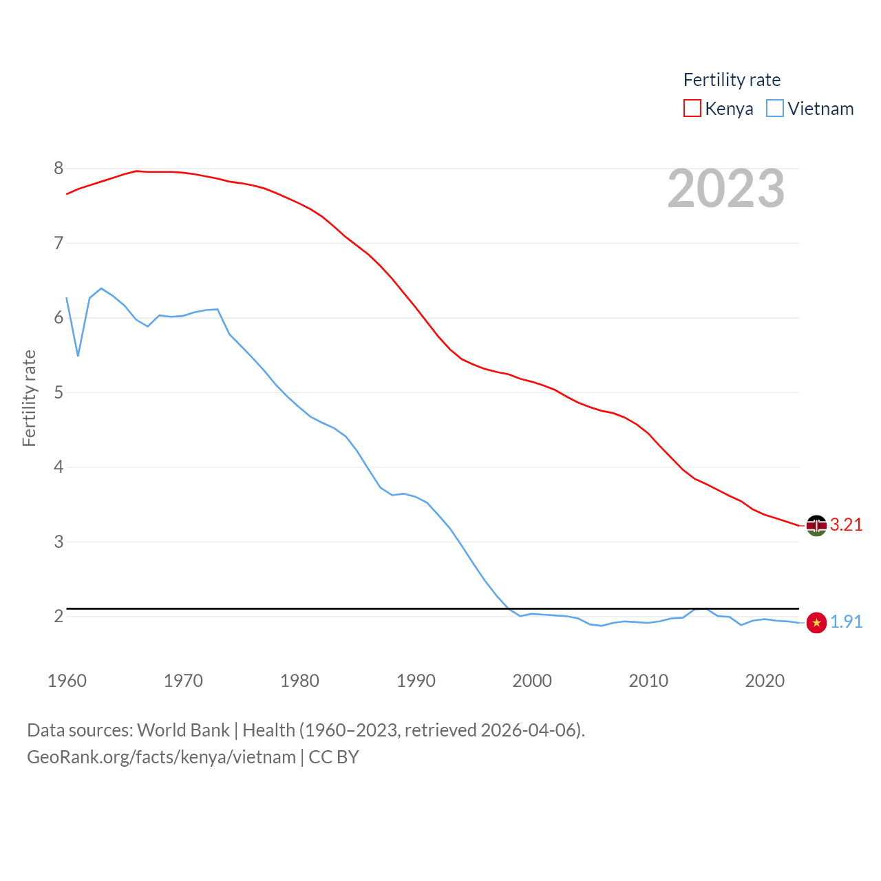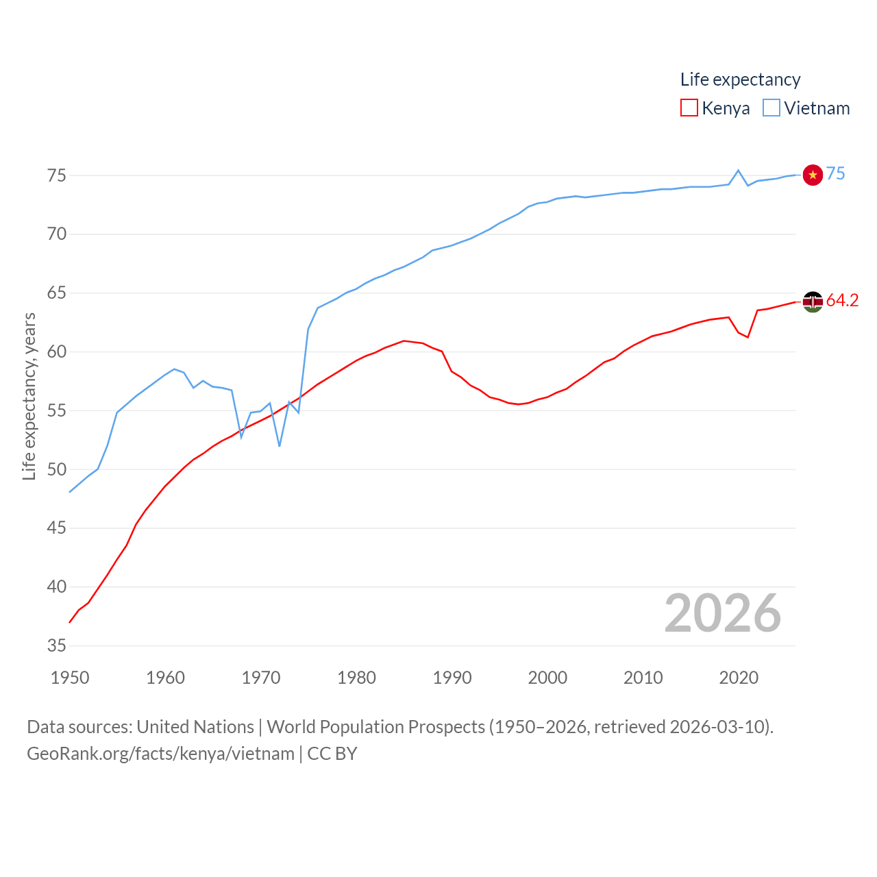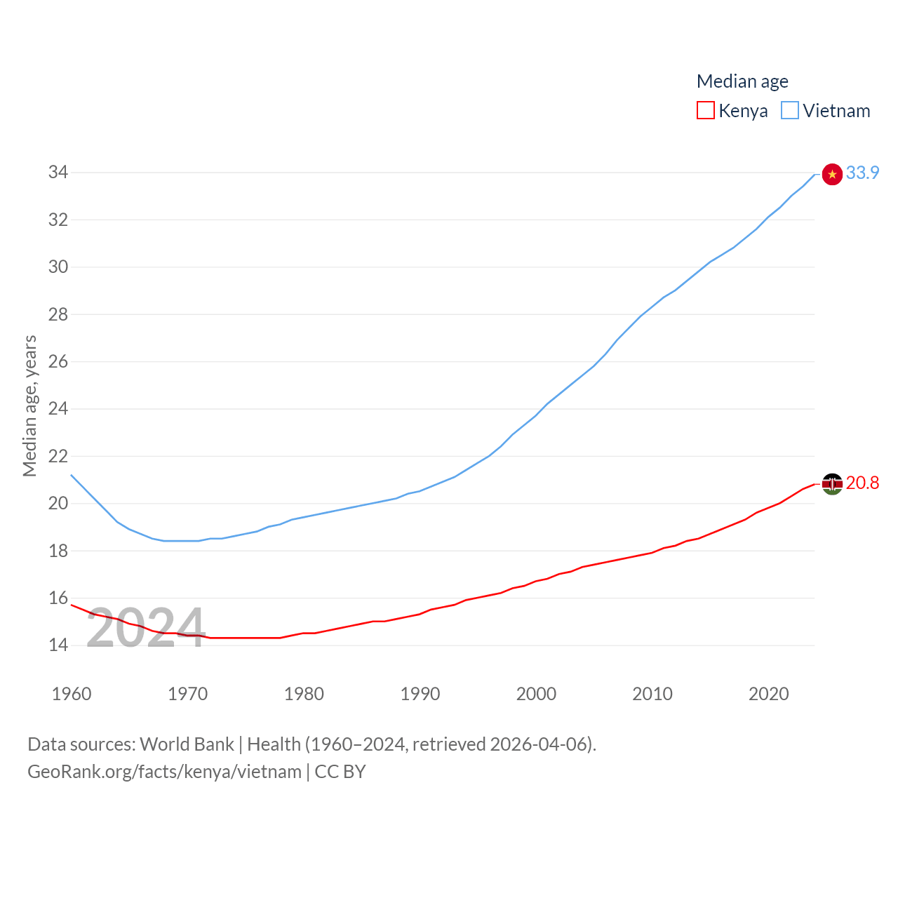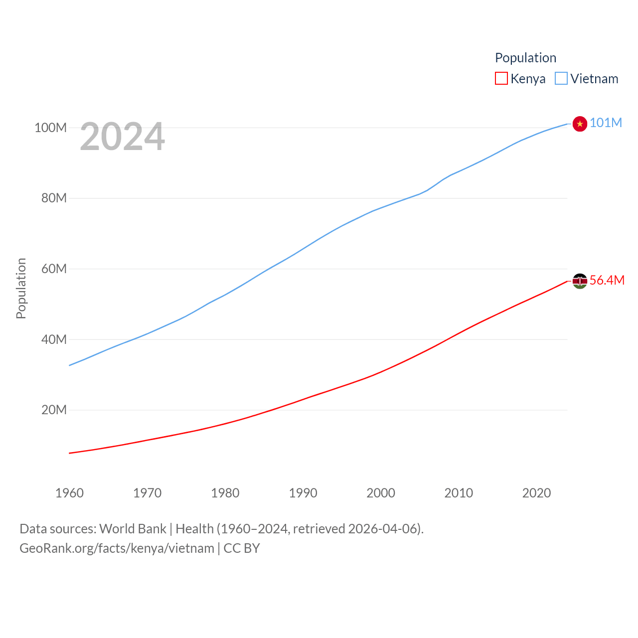Kenya has a population of 56.4M (ranked 26/197), compared with 101M in Vietnam (ranked 16/197). Kenya's land area is 224,278 sq mi versus 121,016 sq mi for Vietnam (ranked 45th vs. 67th).