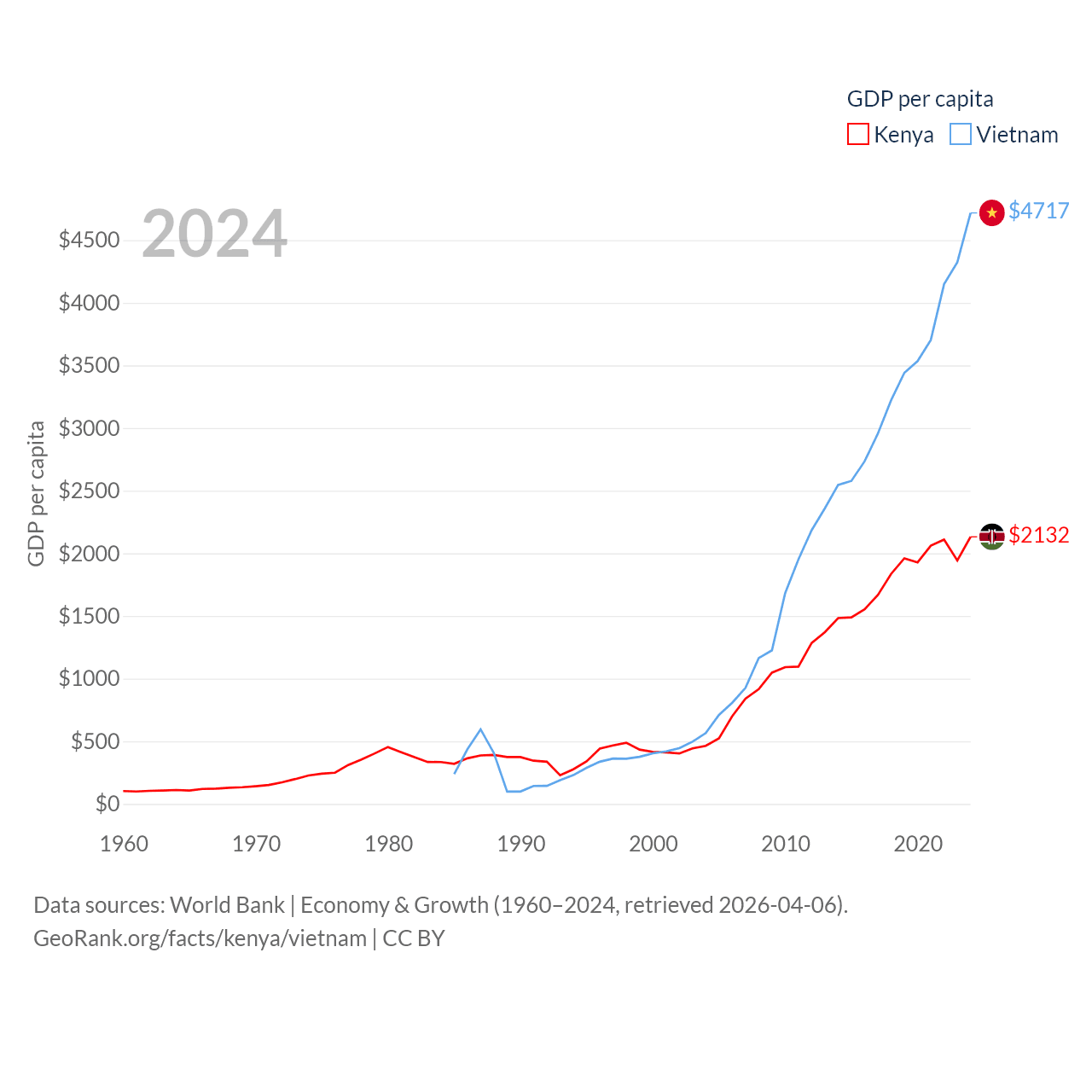 By GDP, Kenya ranks 64/197 ($120B) and Vietnam ranks 33/197 ($476B). By GDP per capita, Kenya ranks 154/197 ($2,132), while Vietnam ranks 122/197 ($4,717).