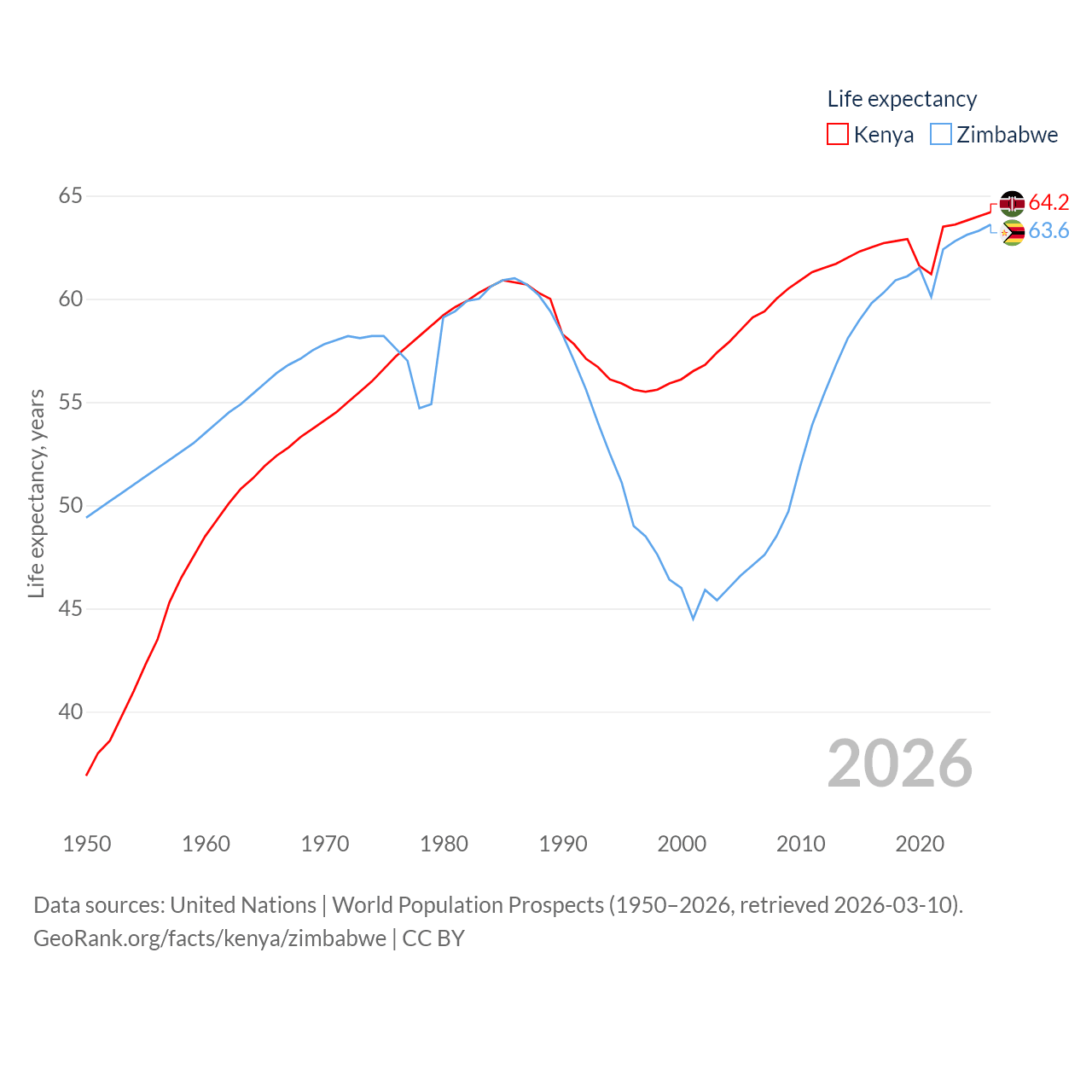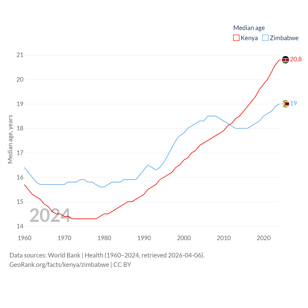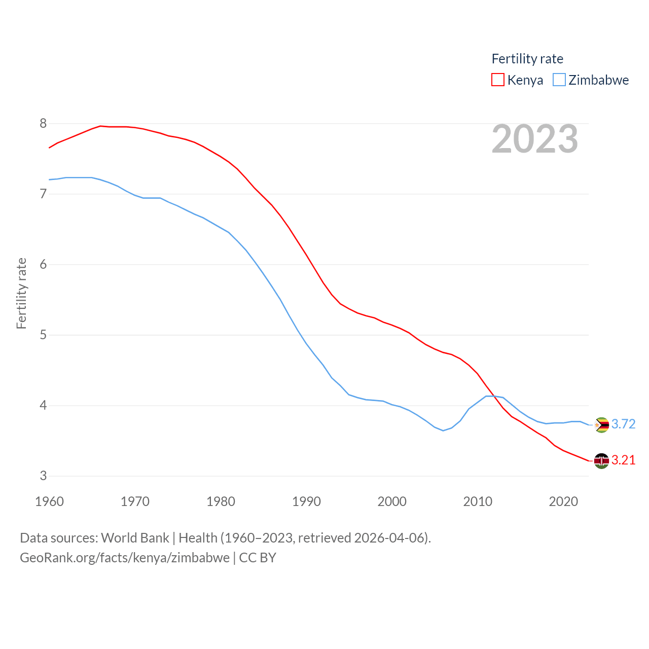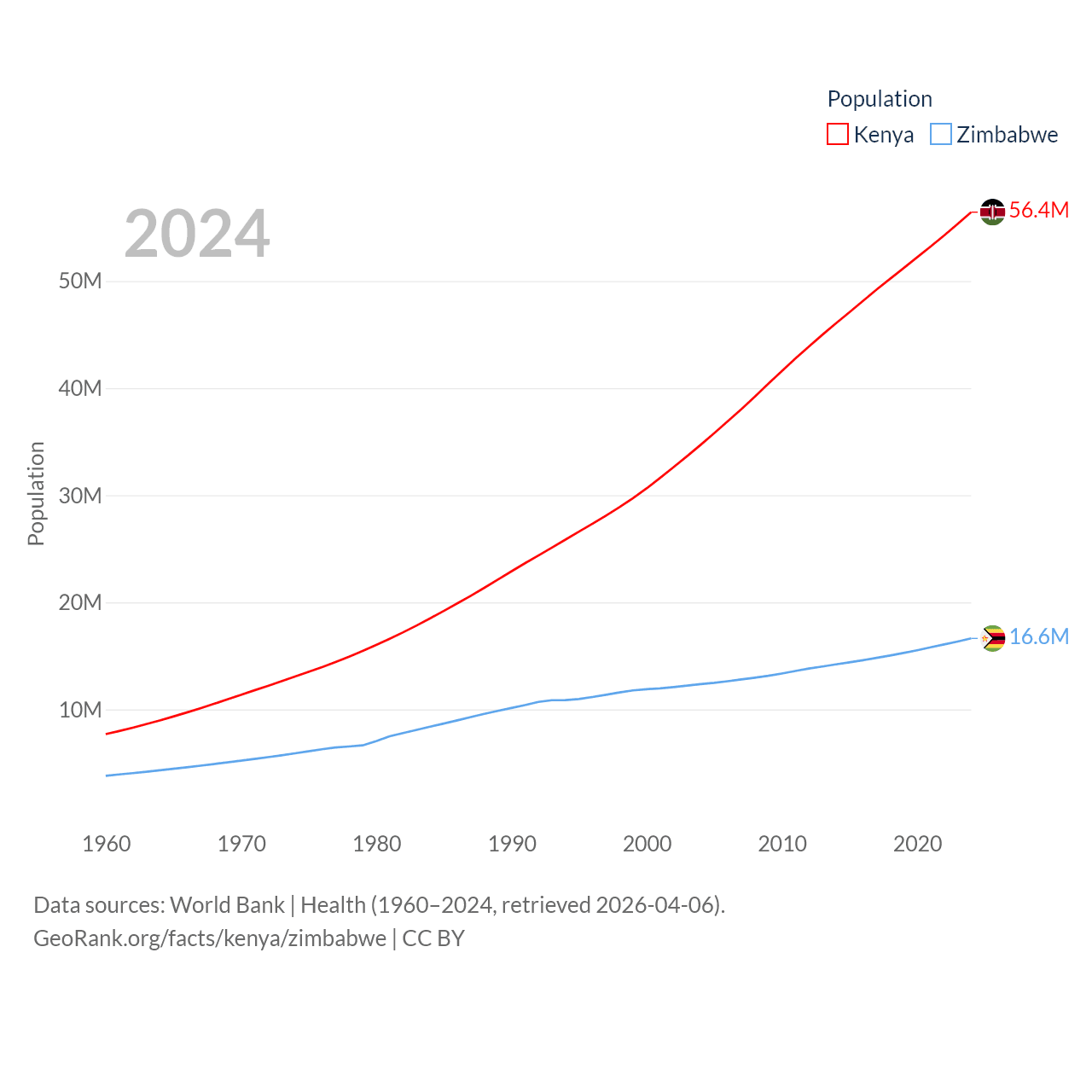 Kenya has a population of 56.4M (ranked 26/197), compared with 16.6M in Zimbabwe (ranked 74/197). Kenya's land area is 224,278 sq mi versus 149,364 sq mi for Zimbabwe (ranked 45th vs. 60th).