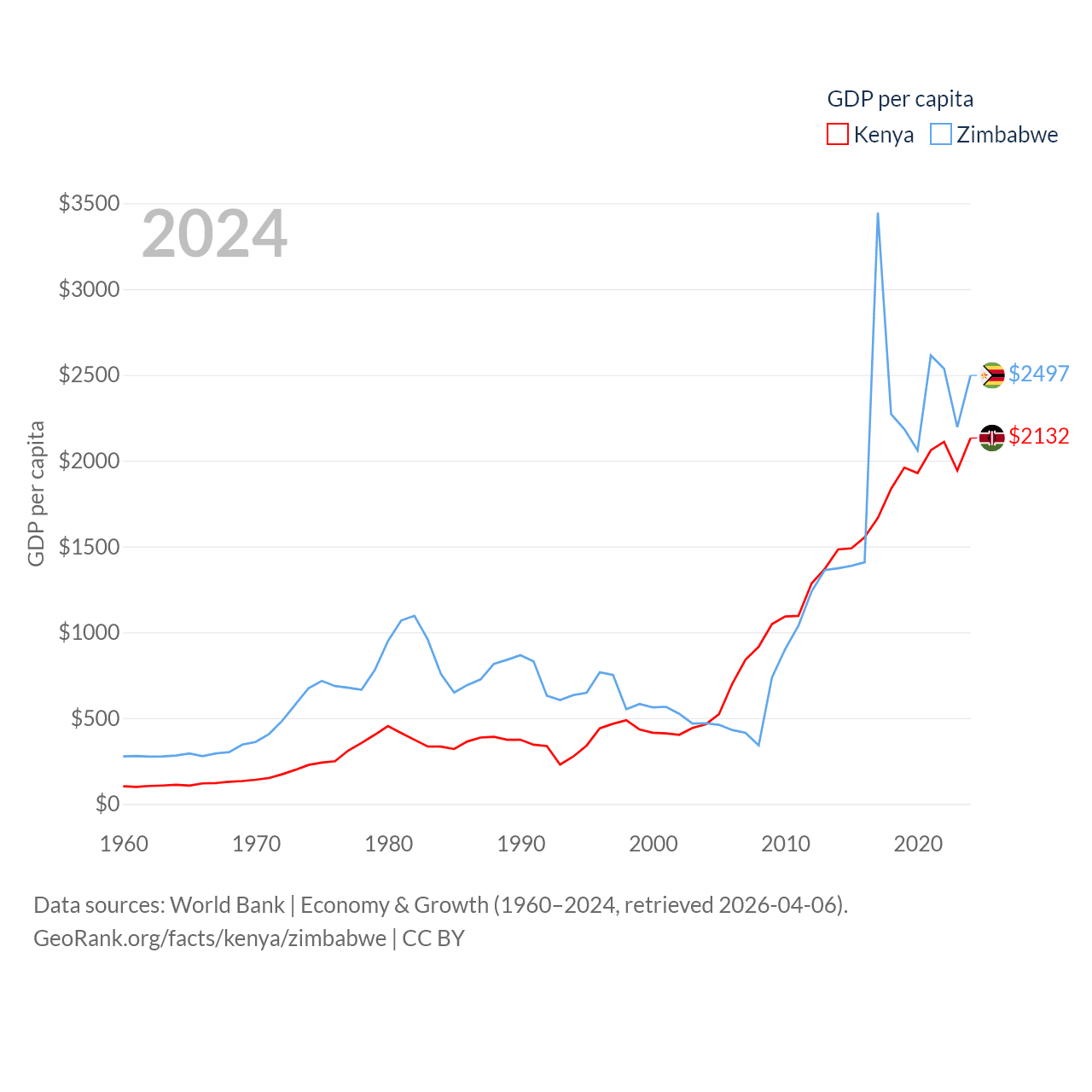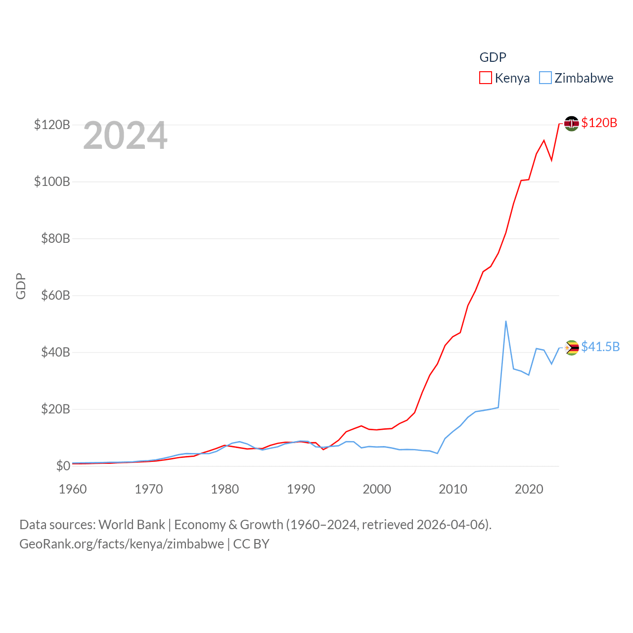 By GDP, Kenya ranks 64/197 ($120B) and Zimbabwe ranks 102/197 ($41.5B). By GDP per capita, Kenya ranks 154/197 ($2,132), while Zimbabwe ranks 148/197 ($2,497).