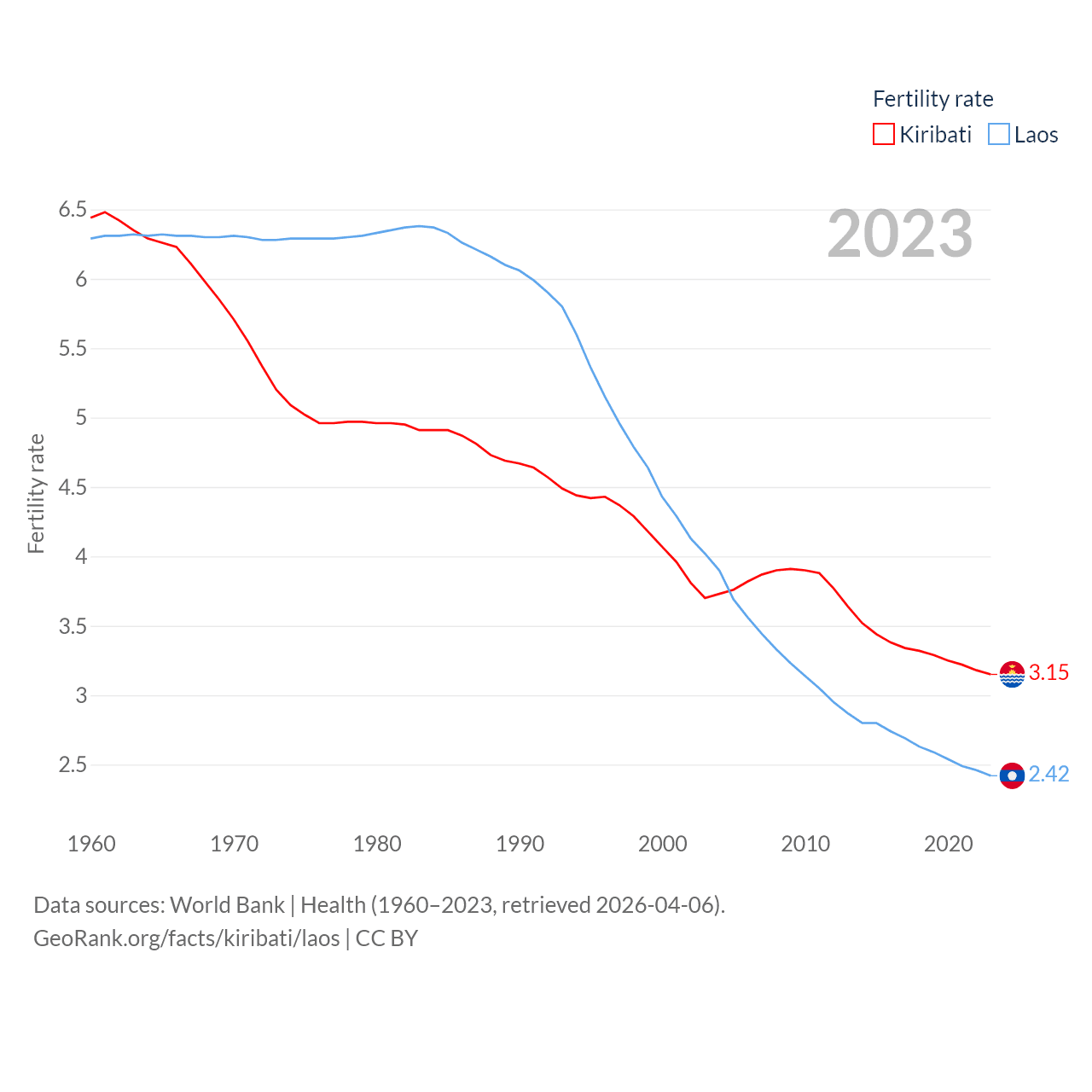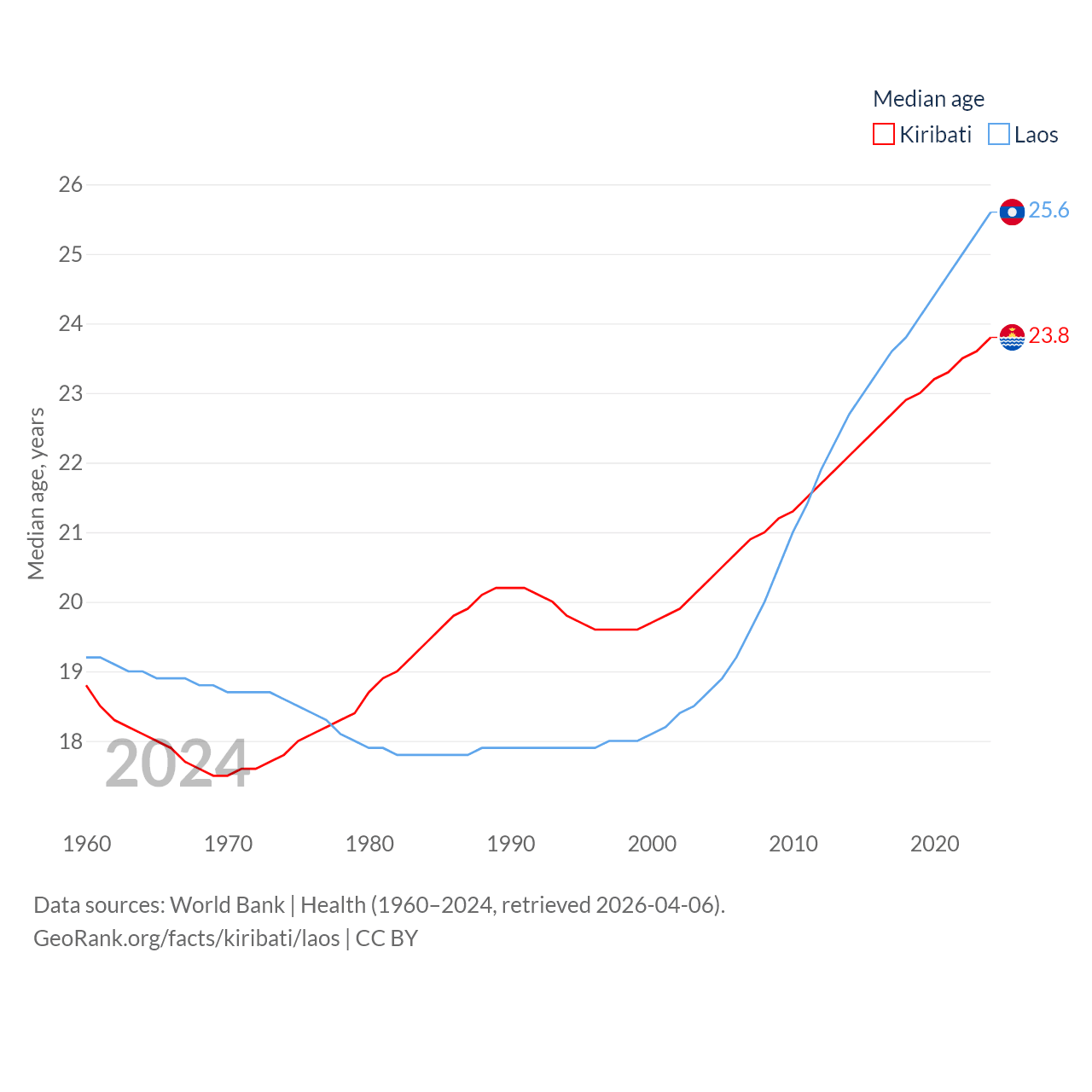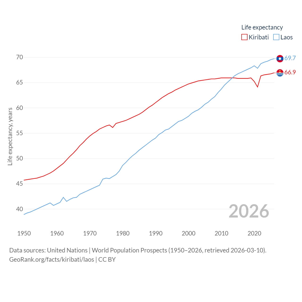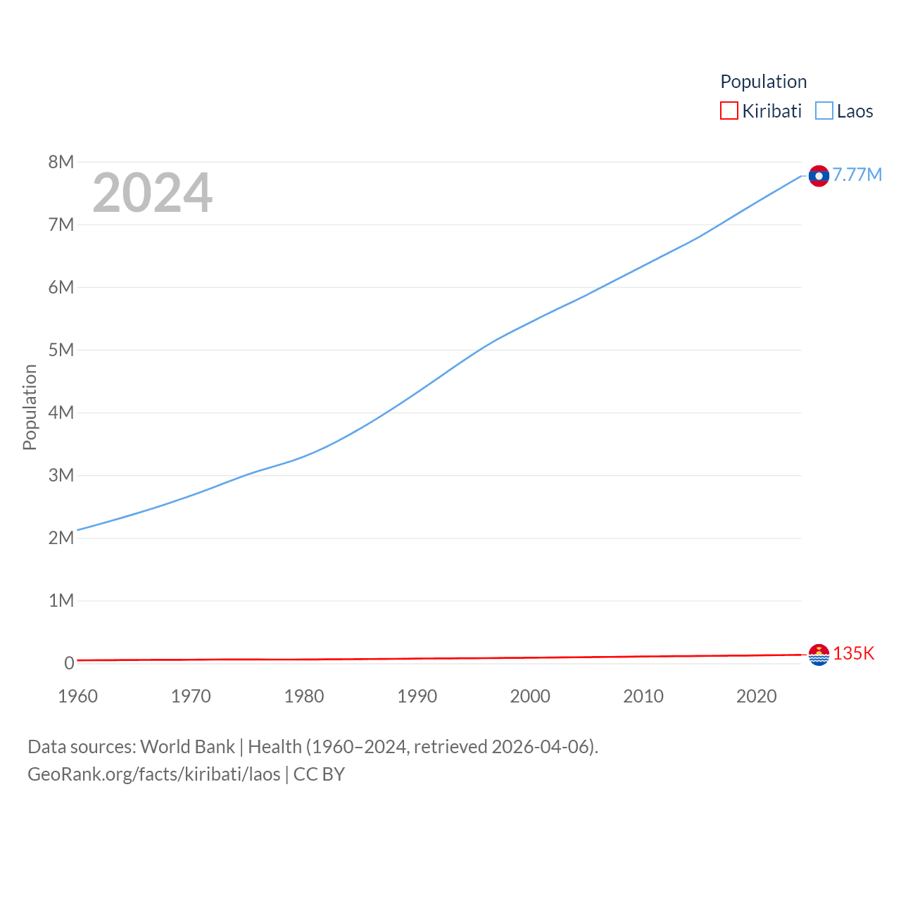 Kiribati has a population of 135K (ranked 180/197), compared with 7.77M in Laos (ranked 103/197). Kiribati's land area is 313 sq mi versus 89,112 sq mi for Laos (ranked 173rd vs. 79th).