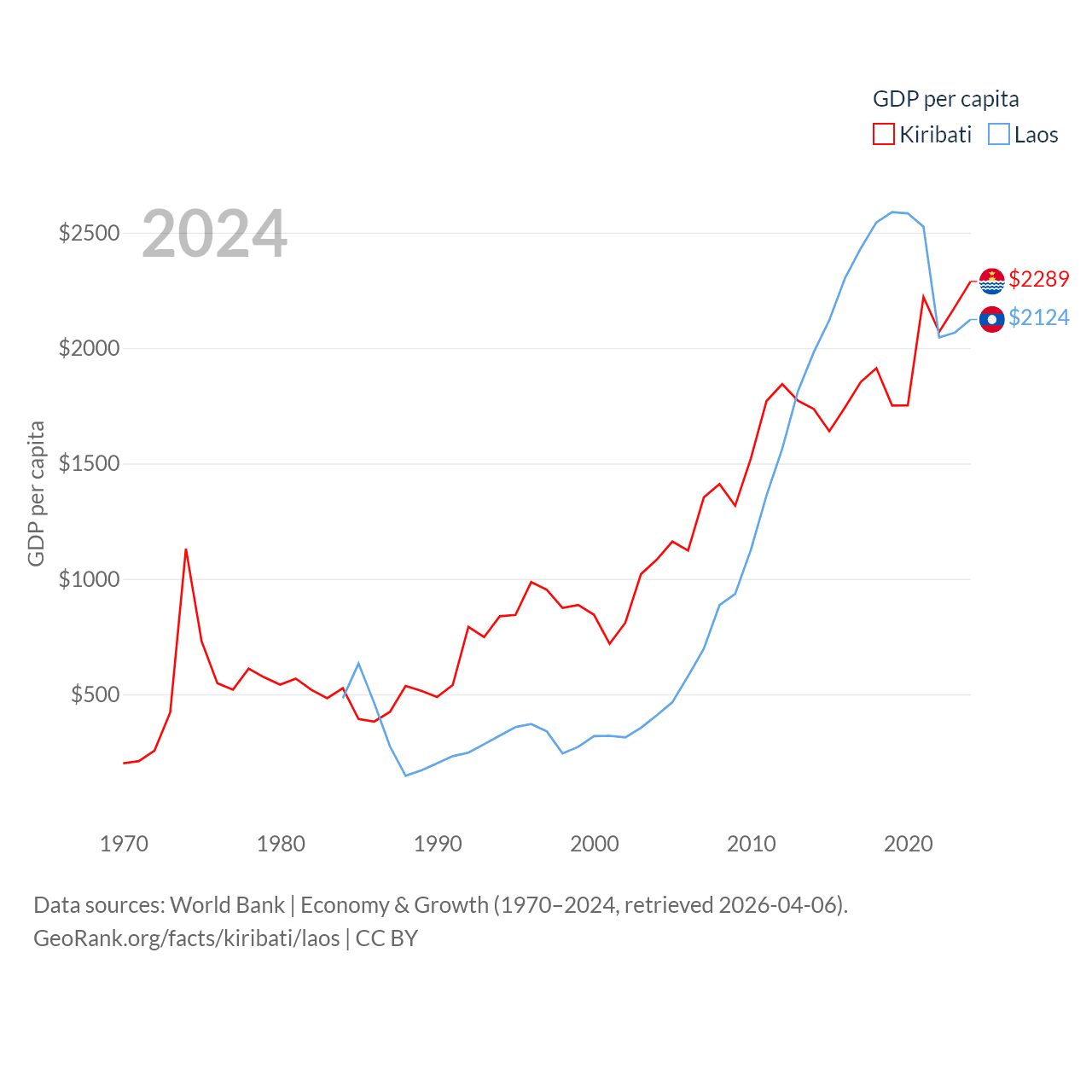 By GDP, Kiribati ranks 192/197 ($308M) and Laos ranks 139/197 ($16.5B). By GDP per capita, Kiribati ranks 152/197 ($2,289), while Laos ranks 155/197 ($2,124).