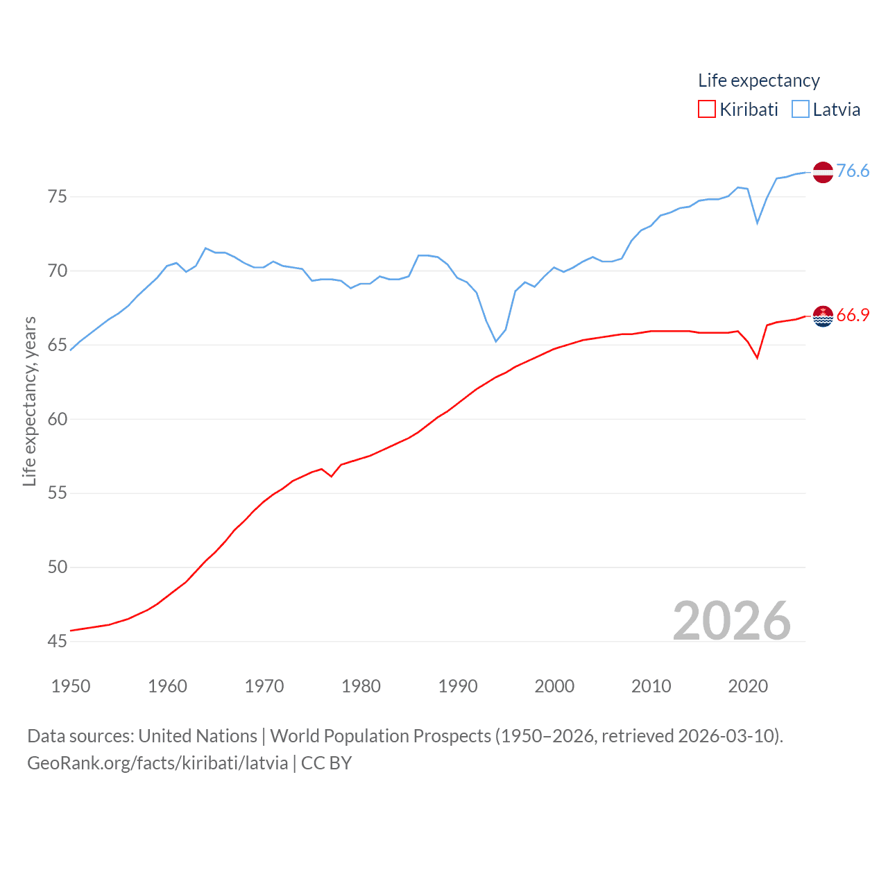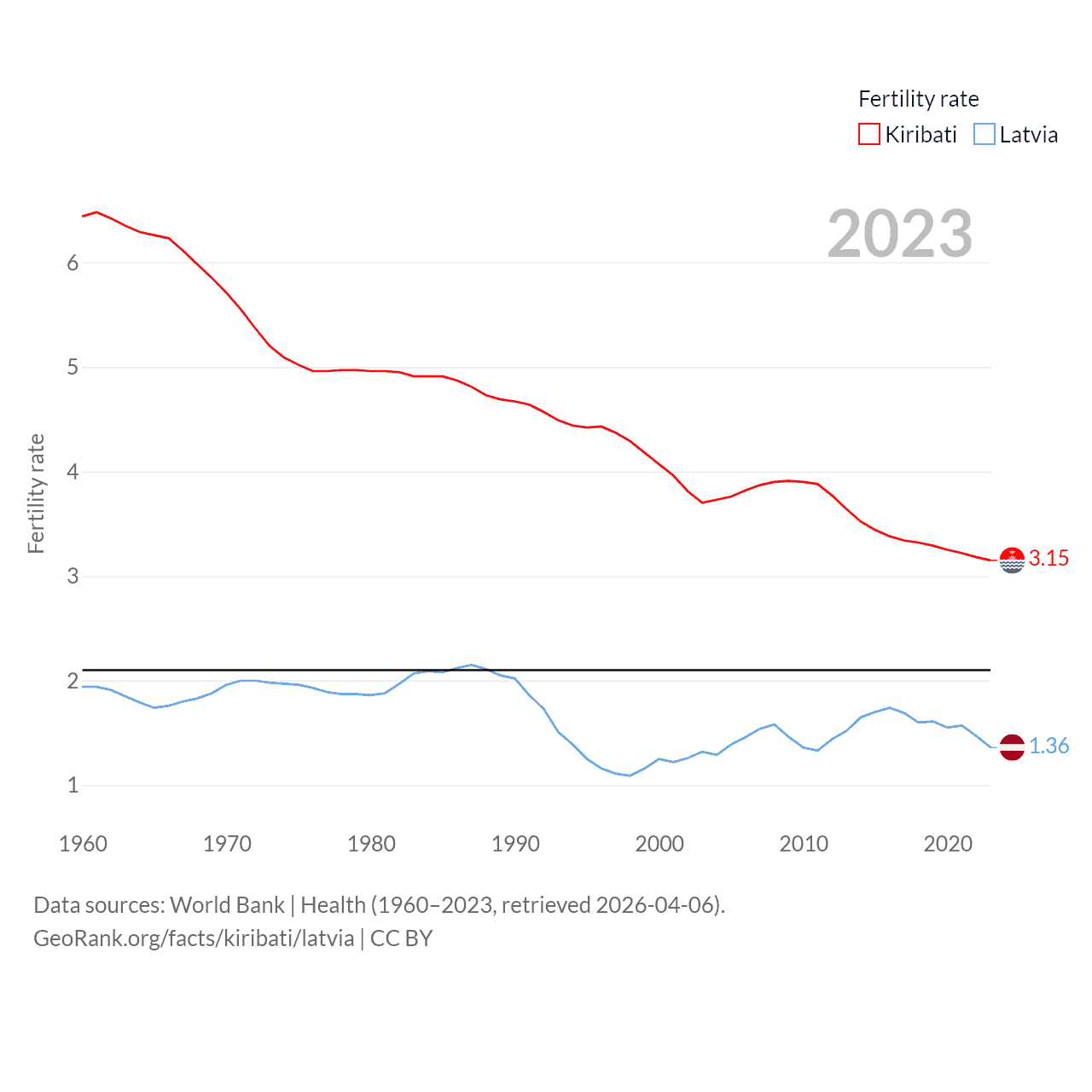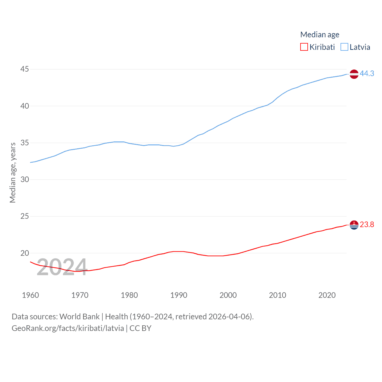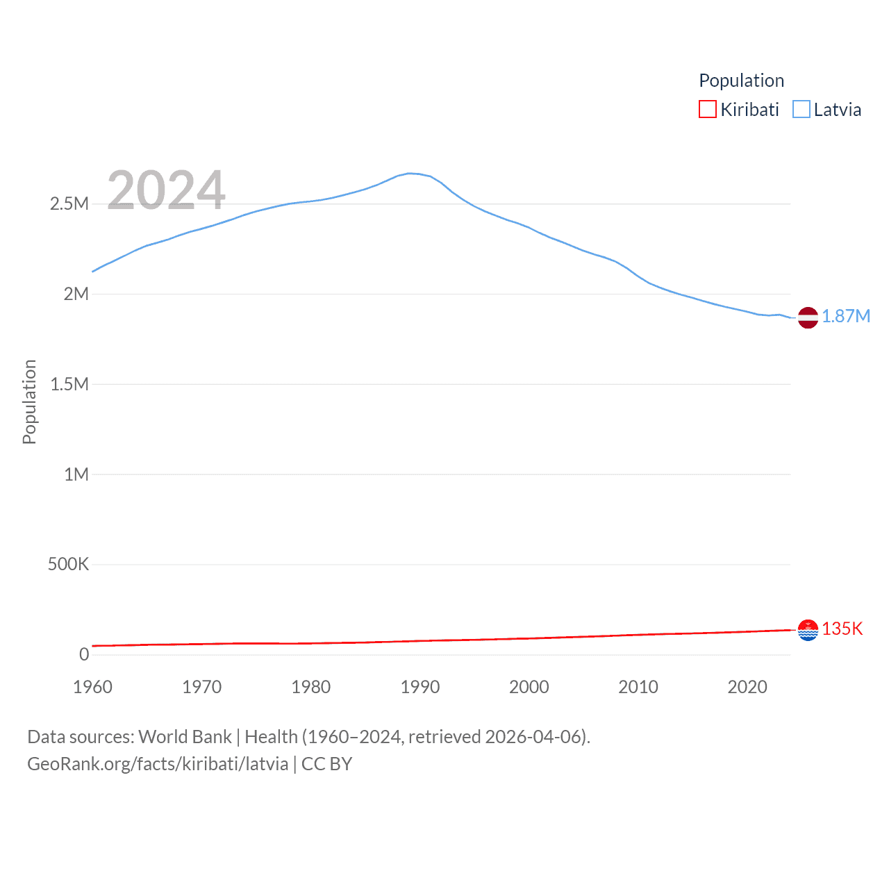 Kiribati has a population of 135K (ranked 180/197), compared with 1.87M in Latvia (ranked 149/197). Kiribati's land area is 313 sq mi versus 24,027 sq mi for Latvia (ranked 173rd vs. 121st).