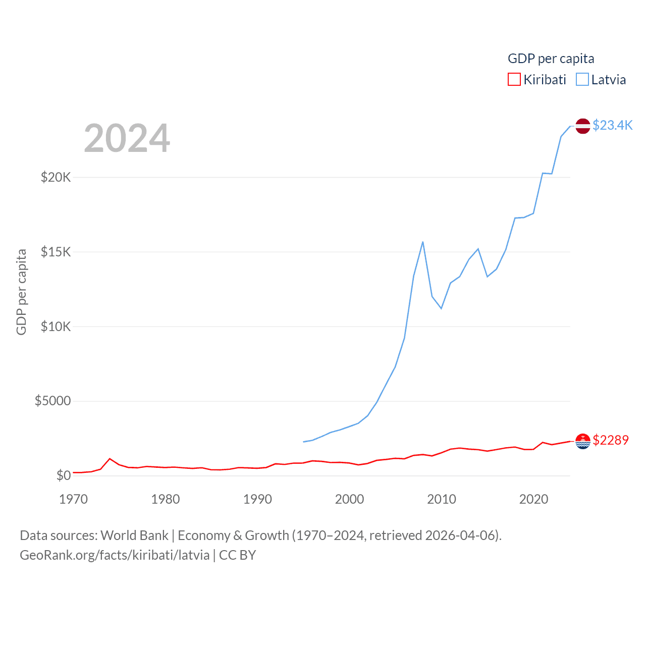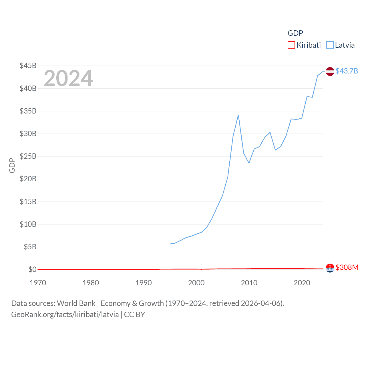 By GDP, Kiribati ranks 192/197 ($308M) and Latvia ranks 99/197 ($43.7B). By GDP per capita, Kiribati ranks 152/197 ($2,289), while Latvia ranks 54/197 ($23,409).