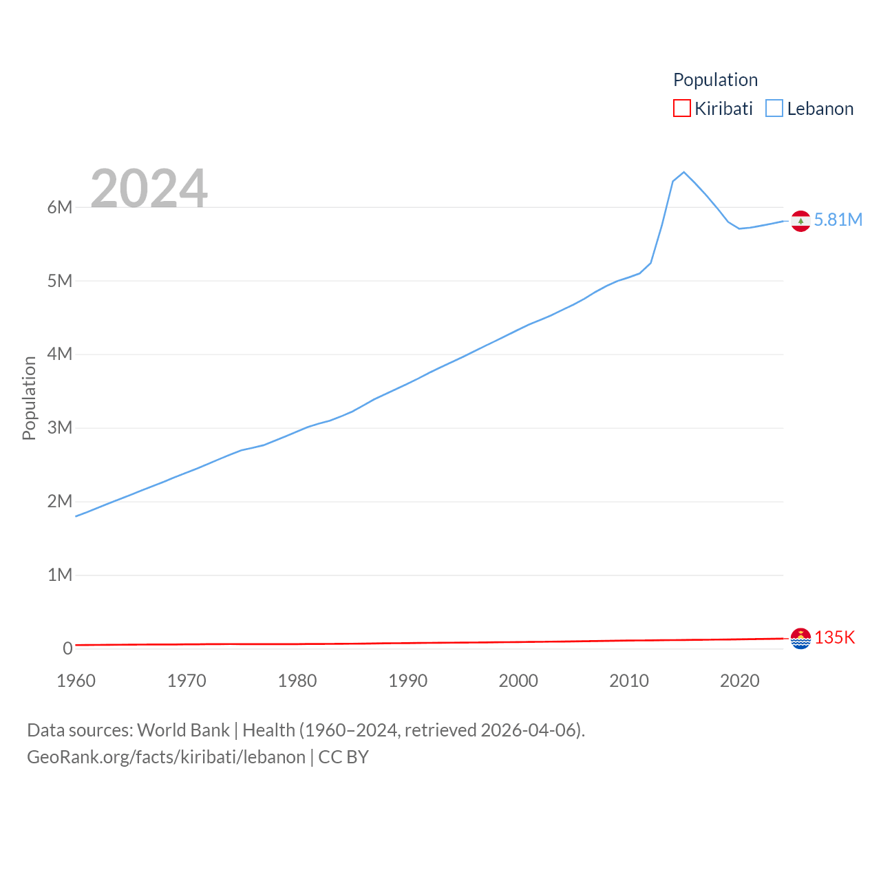 Kiribati has a population of 135K (ranked 180/197), compared with 5.81M in Lebanon (ranked 115/197). Kiribati's land area is 313 sq mi versus 3,950 sq mi for Lebanon (ranked 173rd vs. 160th).