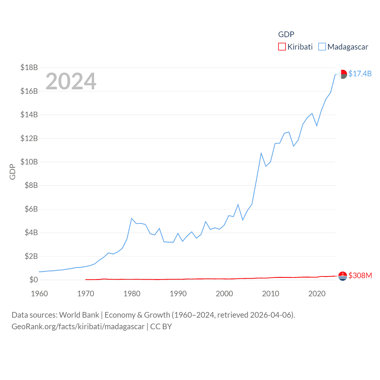 By GDP, Kiribati ranks 192/197 ($308M) and Madagascar ranks 136/197 ($17.4B). By GDP per capita, Kiribati ranks 152/197 ($2,289), while Madagascar ranks 193/197 ($545).
