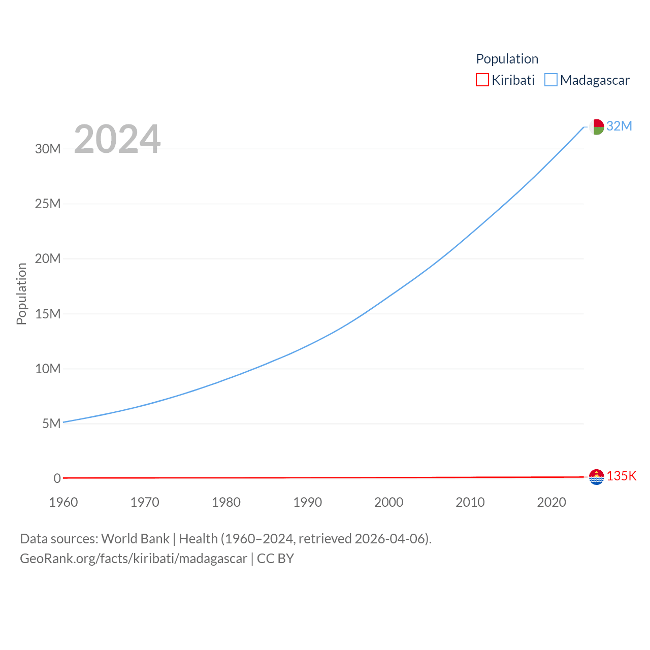 Kiribati has a population of 135K (ranked 180/197), compared with 32M in Madagascar (ranked 49/197). Kiribati's land area is 313 sq mi versus 224,634 sq mi for Madagascar (ranked 173rd vs. 44th).