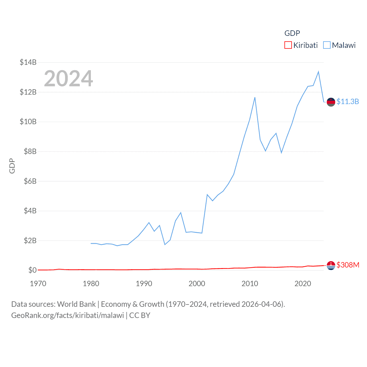 By GDP, Kiribati ranks 192/197 ($308M) and Malawi ranks 151/197 ($11.3B). By GDP per capita, Kiribati ranks 152/197 ($2,289), while Malawi ranks 194/197 ($523).