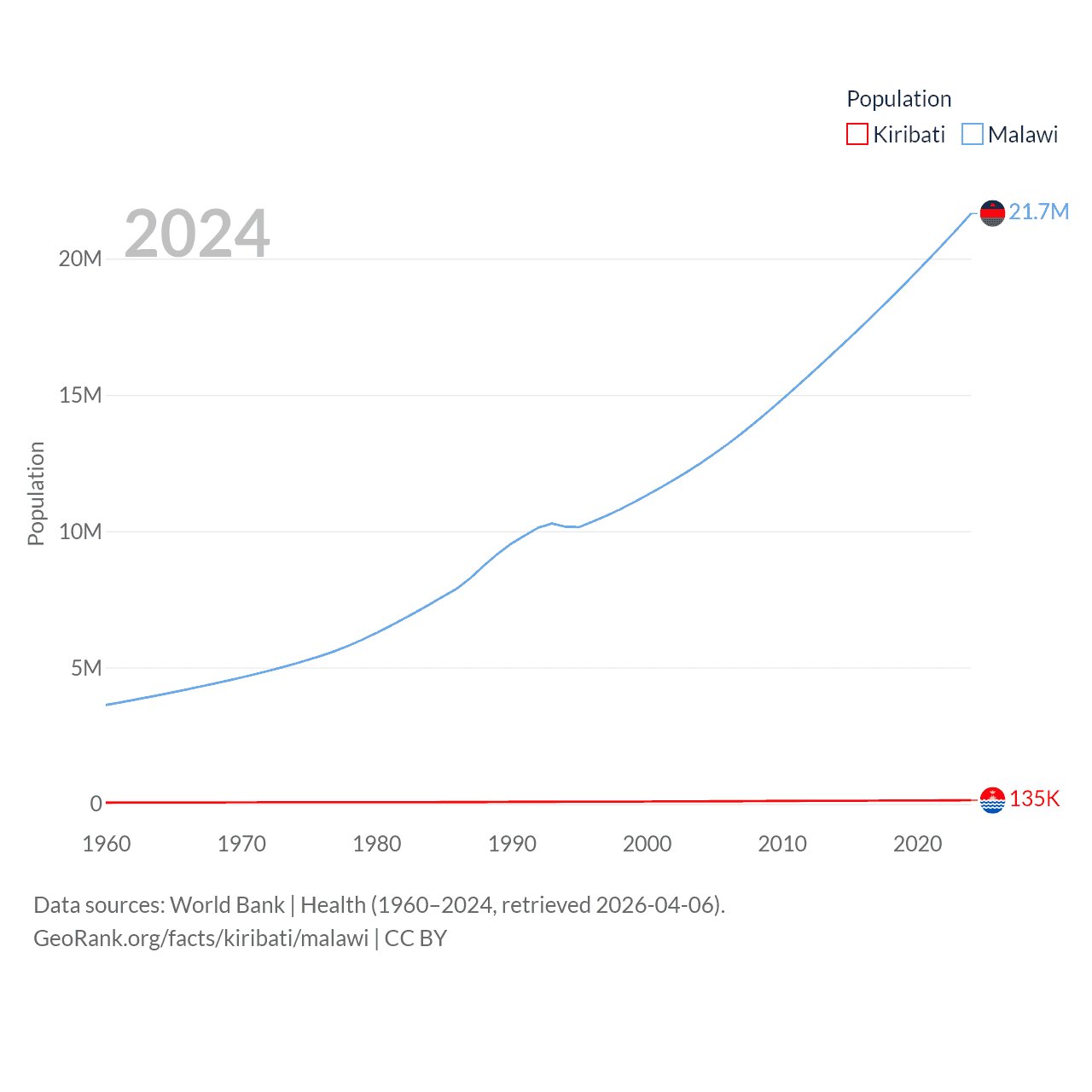 Kiribati has a population of 135K (ranked 180/197), compared with 21.7M in Malawi (ranked 62/197). Kiribati's land area is 313 sq mi versus 36,402 sq mi for Malawi (ranked 173rd vs. 107th).
