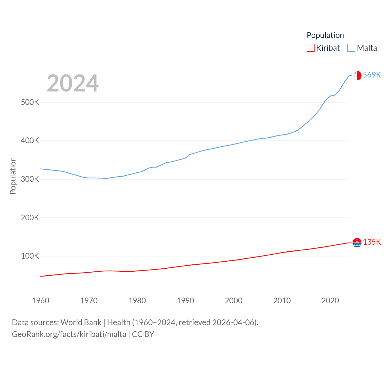 Kiribati has a population of 135K (ranked 180/197), compared with 569K in Malta (ranked 167/197). Kiribati's land area is 313 sq mi versus 123.6 sq mi for Malta (ranked 173rd vs. 187th).