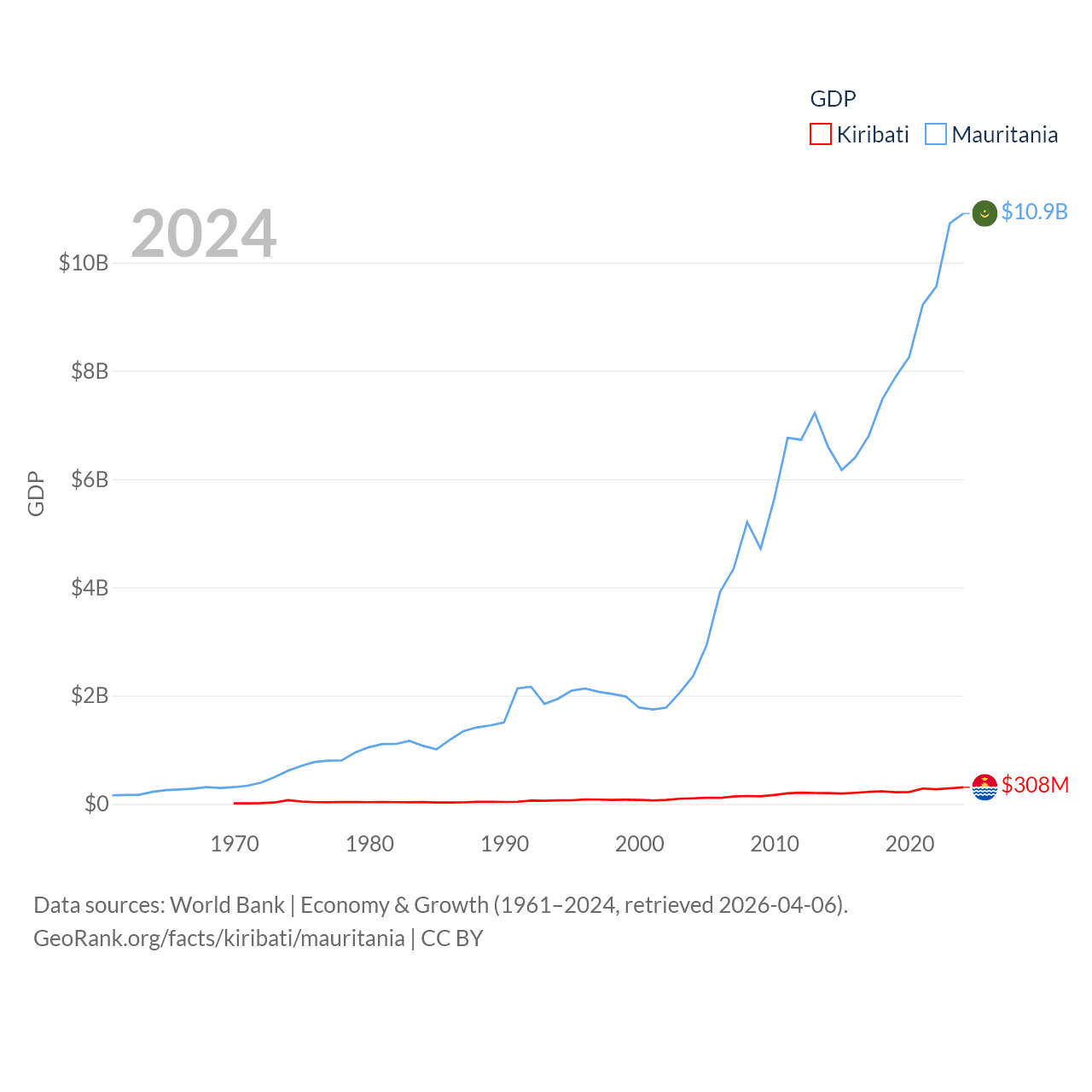 By GDP, Kiribati ranks 192/197 ($308M) and Mauritania ranks 153/197 ($10.9B). By GDP per capita, Kiribati ranks 152/197 ($2,289), while Mauritania ranks 156/197 ($2,110).