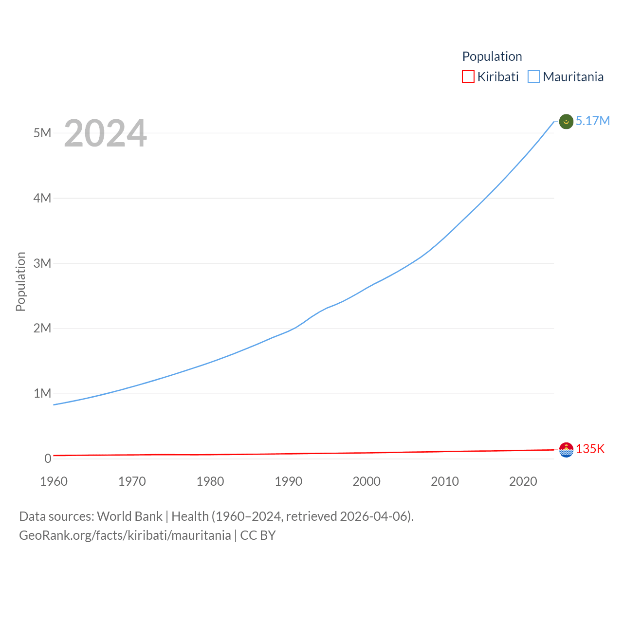 Kiribati has a population of 135K (ranked 180/197), compared with 5.17M in Mauritania (ranked 125/197). Kiribati's land area is 313 sq mi versus 397,955 sq mi for Mauritania (ranked 173rd vs. 28th).