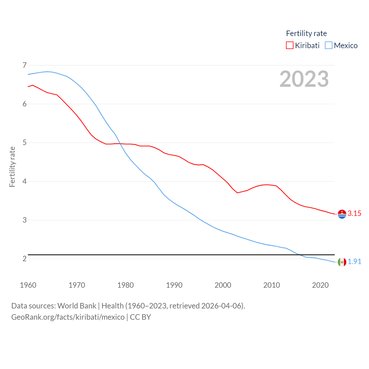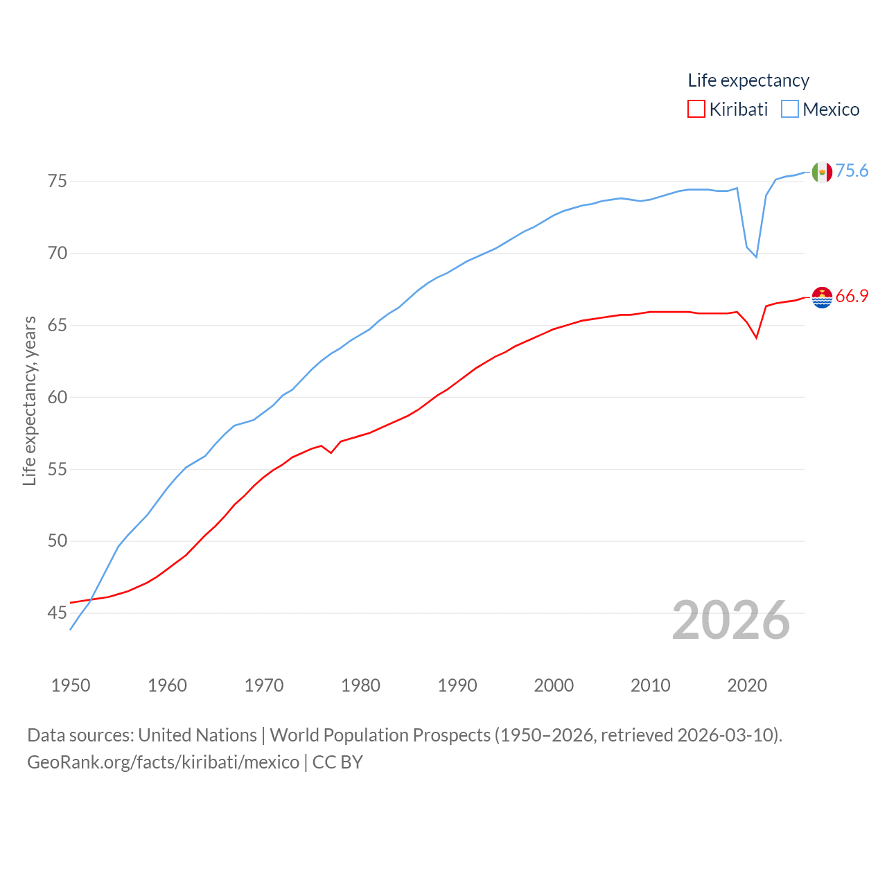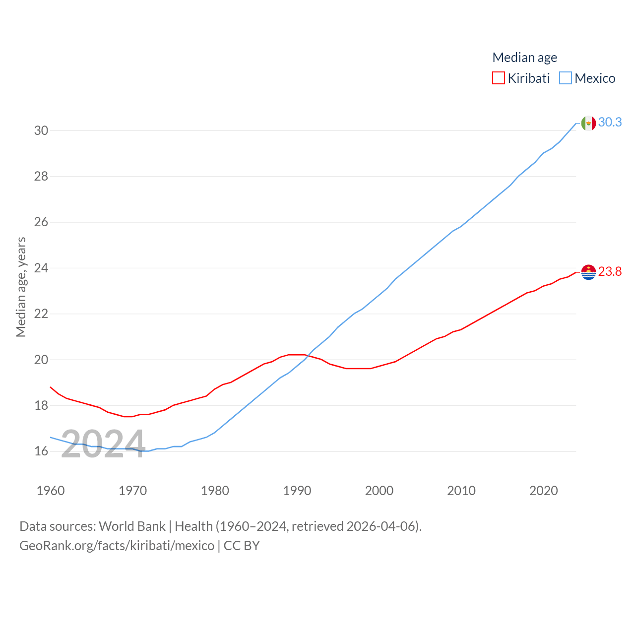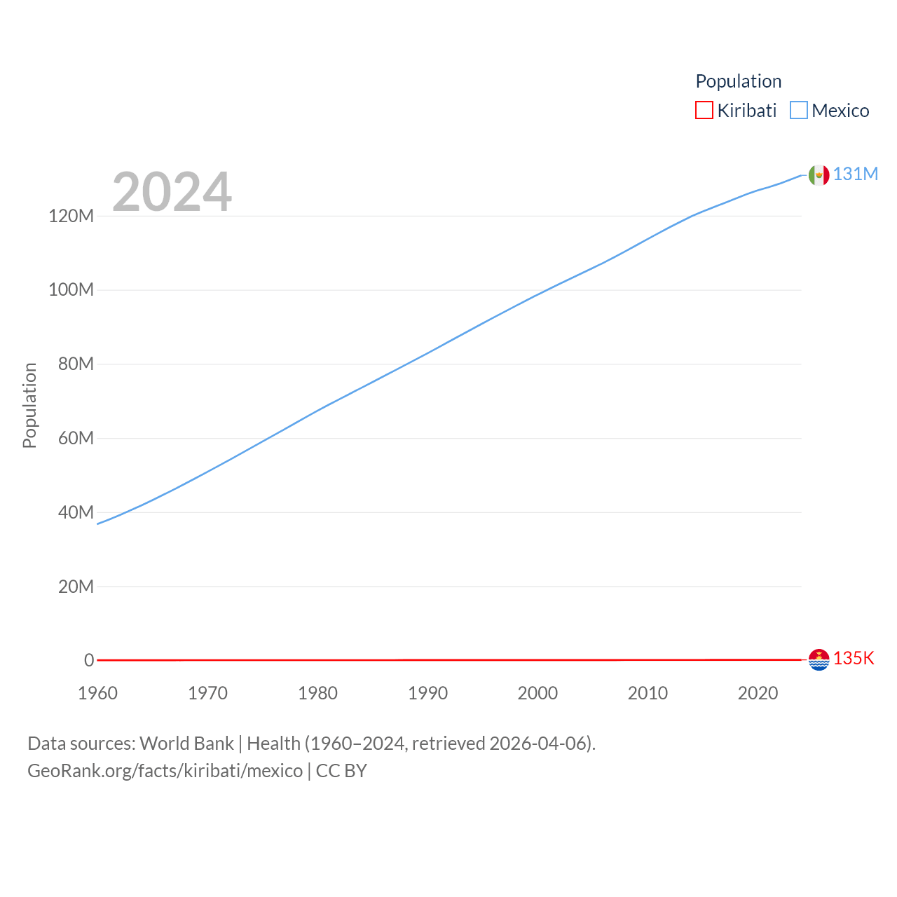 Kiribati has a population of 135K (ranked 180/197), compared with 131M in Mexico (ranked 11/197). Kiribati's land area is 313 sq mi versus 750,563 sq mi for Mexico (ranked 173rd vs. 13th).