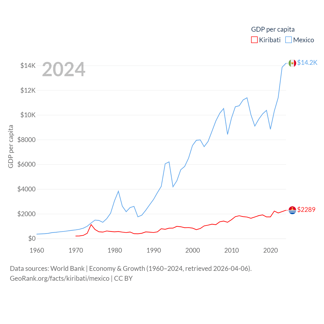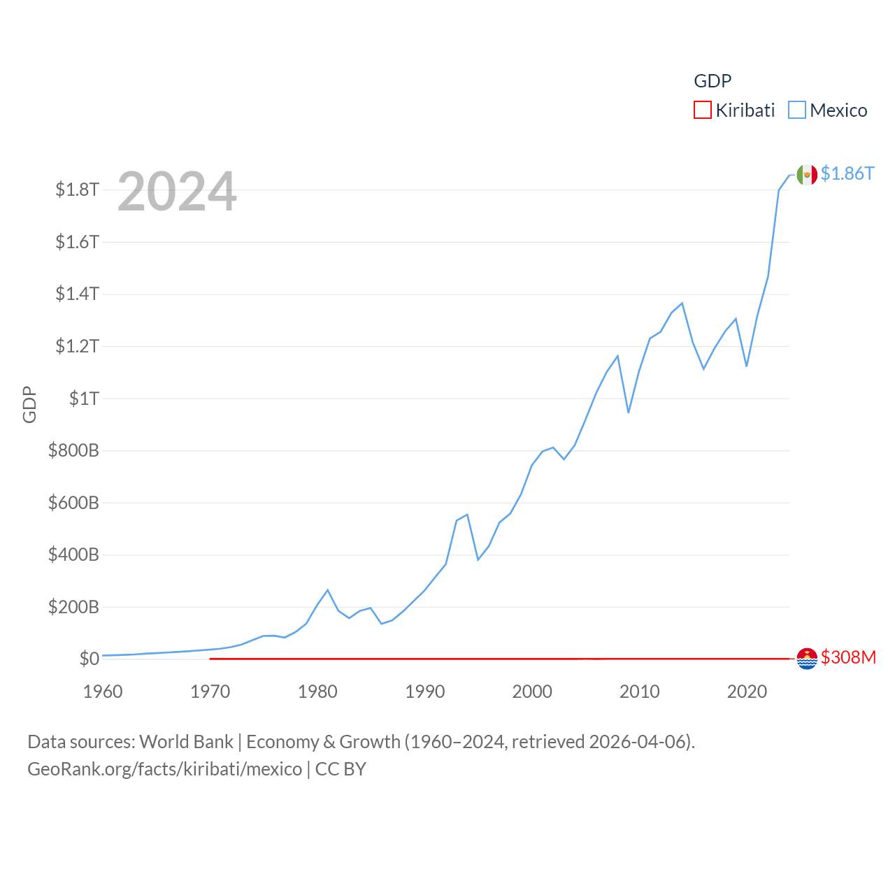 By GDP, Kiribati ranks 192/197 ($308M) and Mexico ranks 13/197 ($1.86T). By GDP per capita, Kiribati ranks 152/197 ($2,289), while Mexico ranks 69/197 ($14,186).
