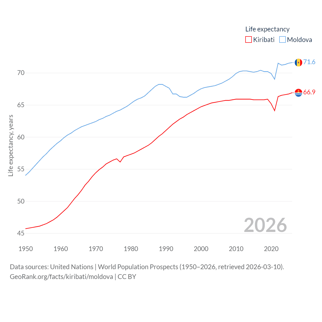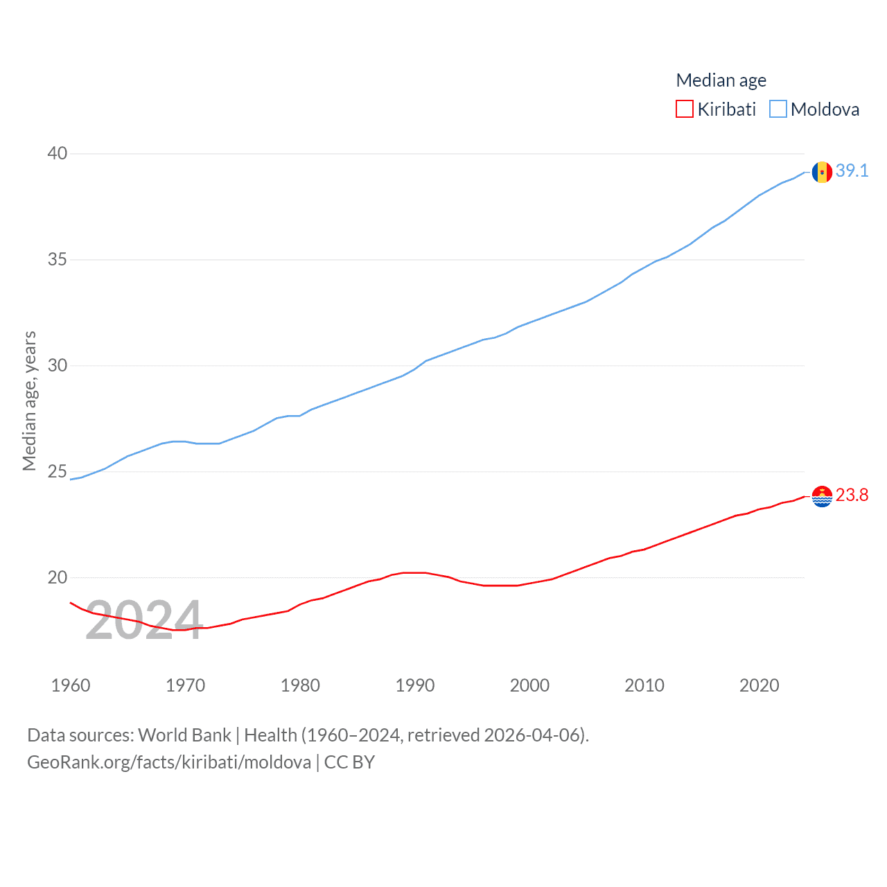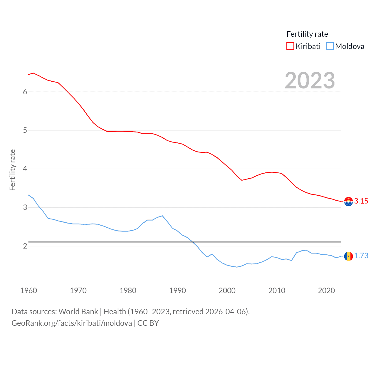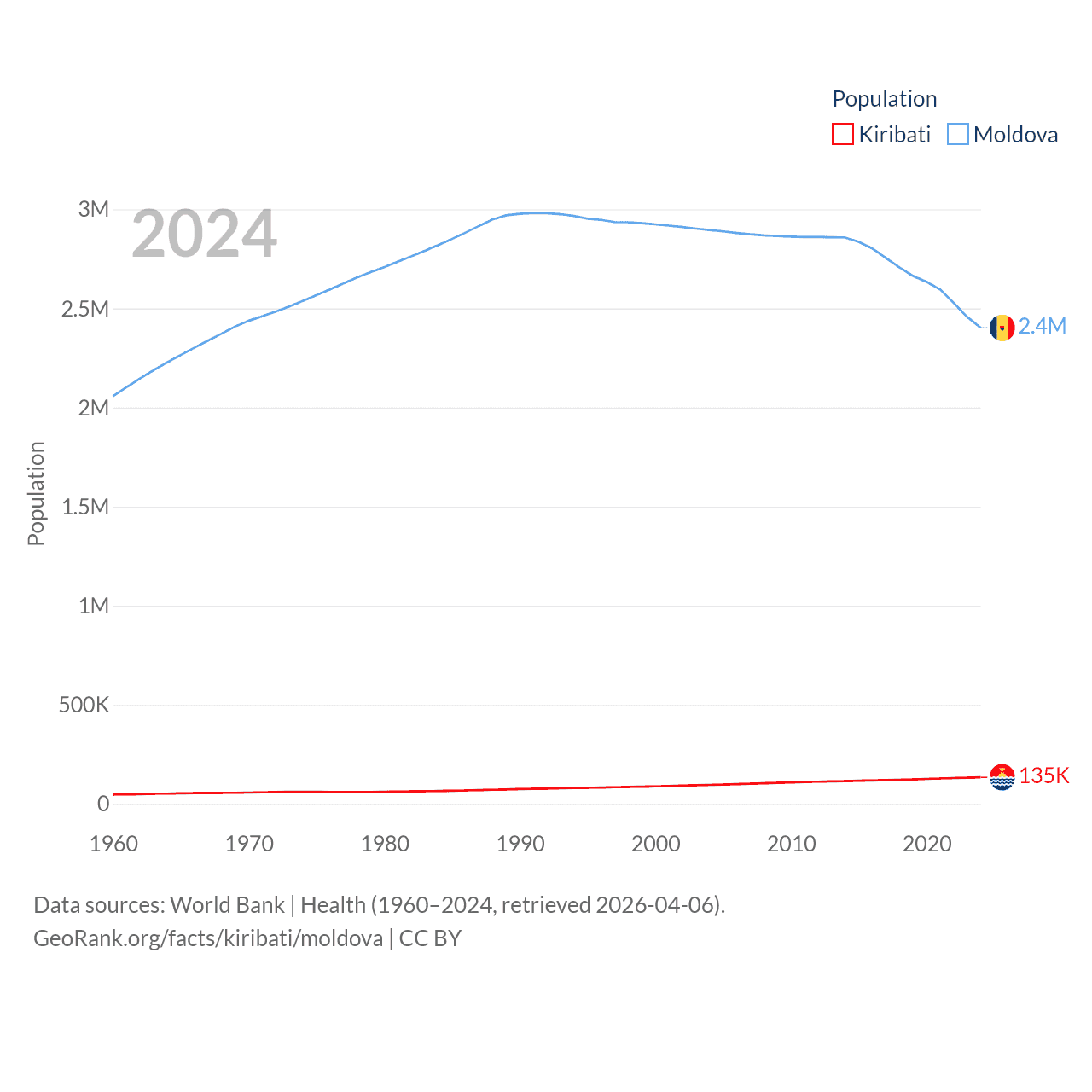 Kiribati has a population of 135K (ranked 180/197), compared with 2.4M in Moldova (ranked 143/197). Kiribati's land area is 313 sq mi versus 12,714 sq mi for Moldova (ranked 173rd vs. 135th).