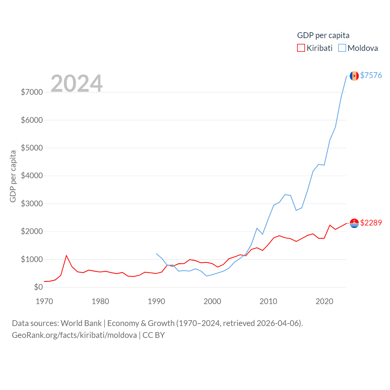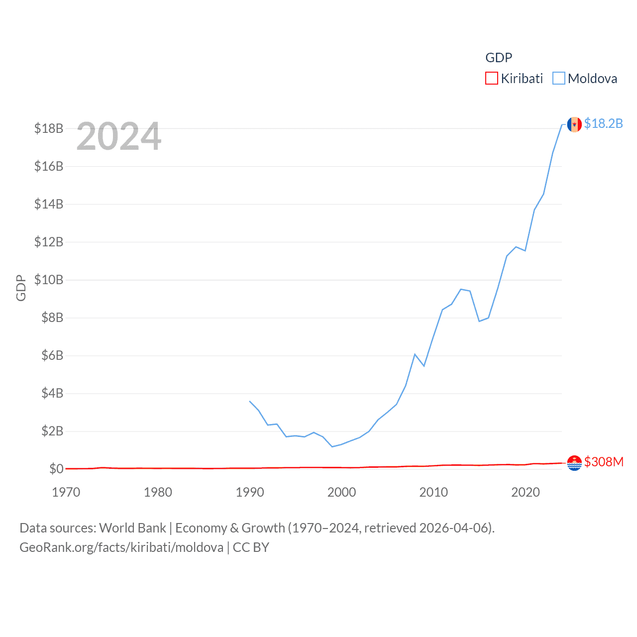 By GDP, Kiribati ranks 192/197 ($308M) and Moldova ranks 134/197 ($18.2B). By GDP per capita, Kiribati ranks 152/197 ($2,289), while Moldova ranks 99/197 ($7,576).