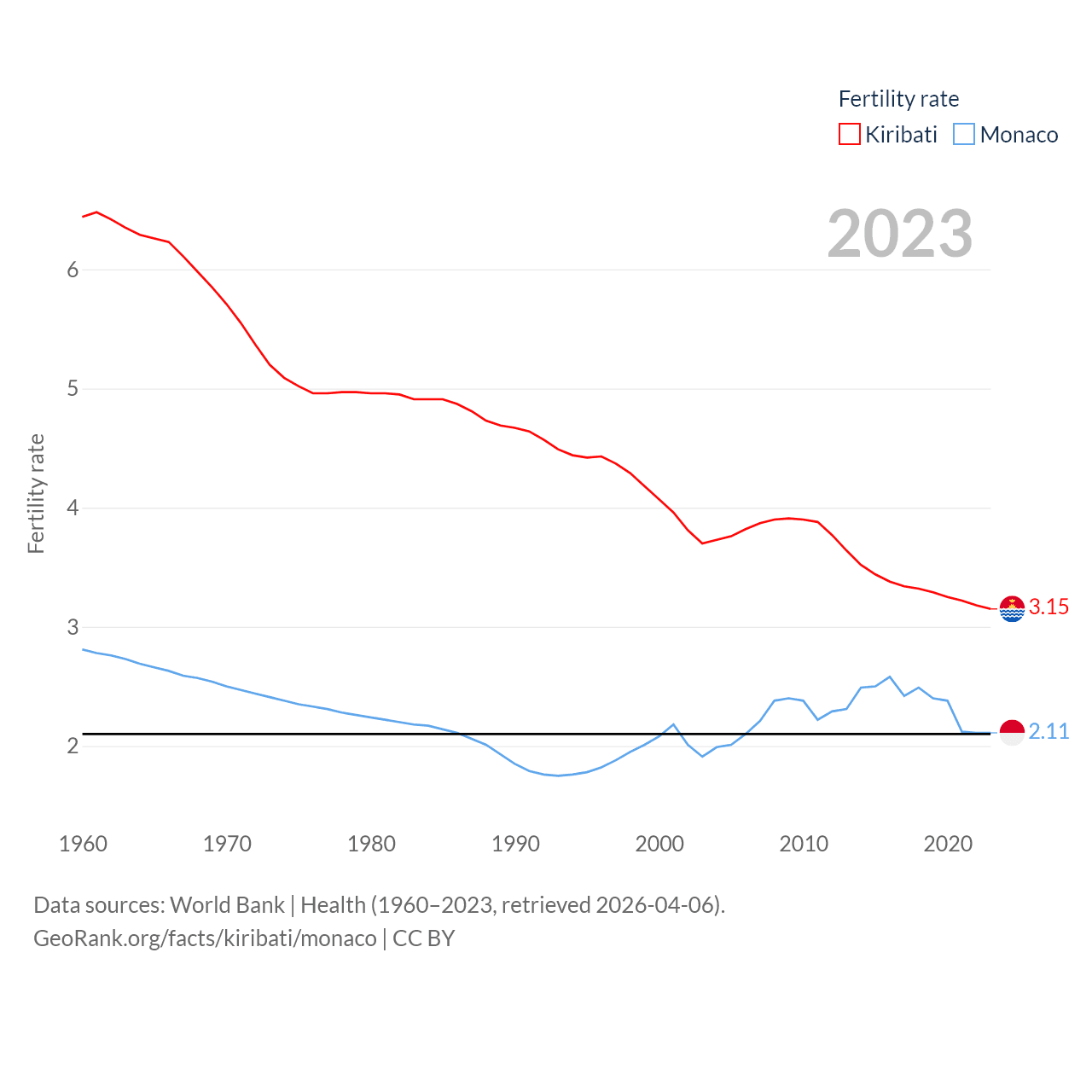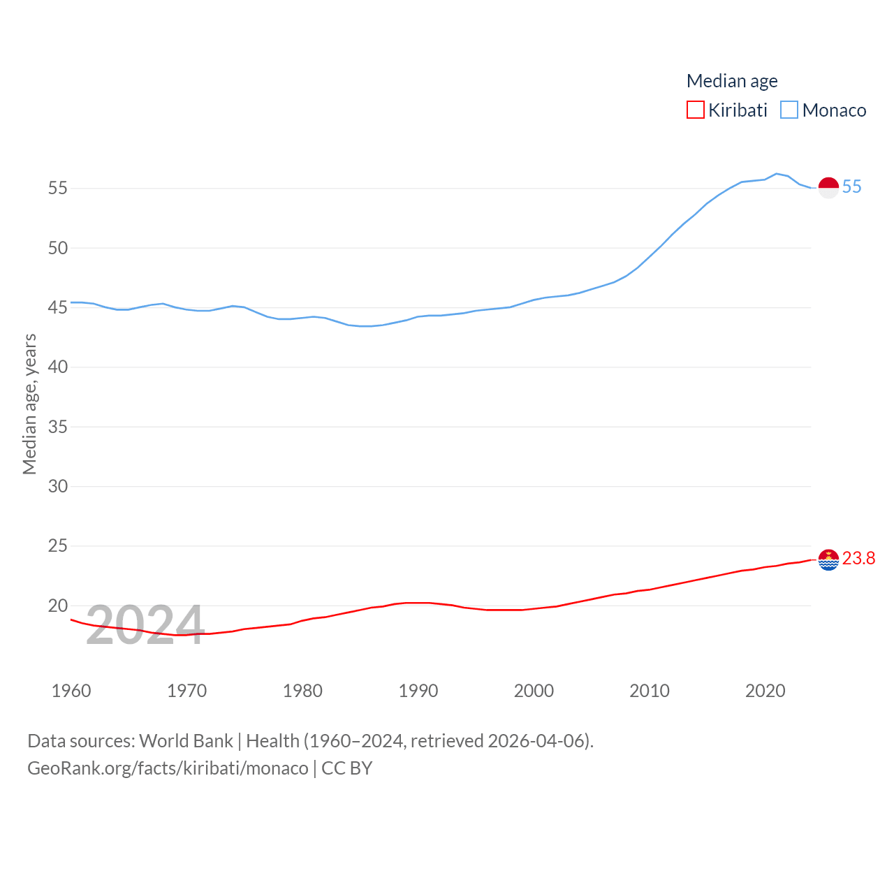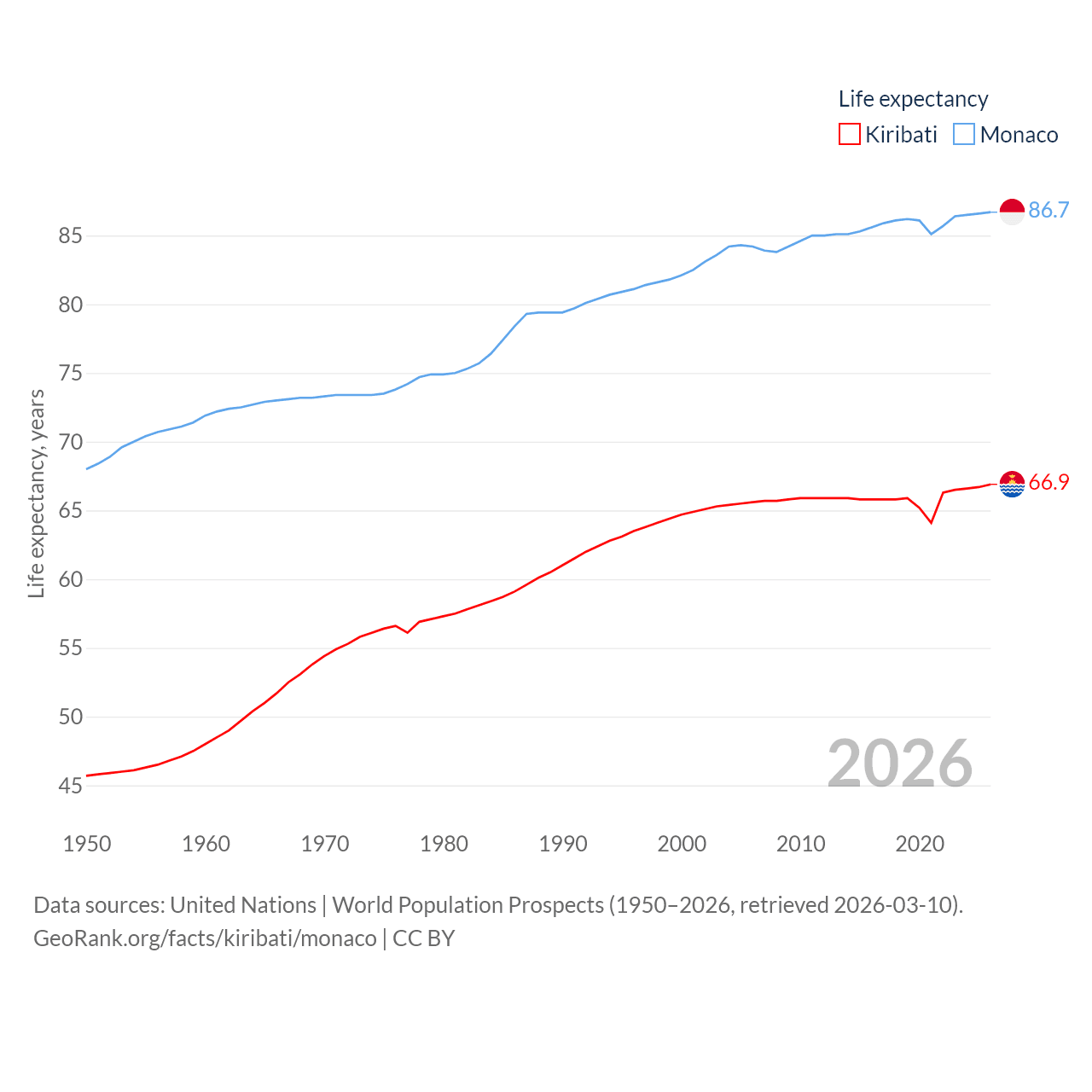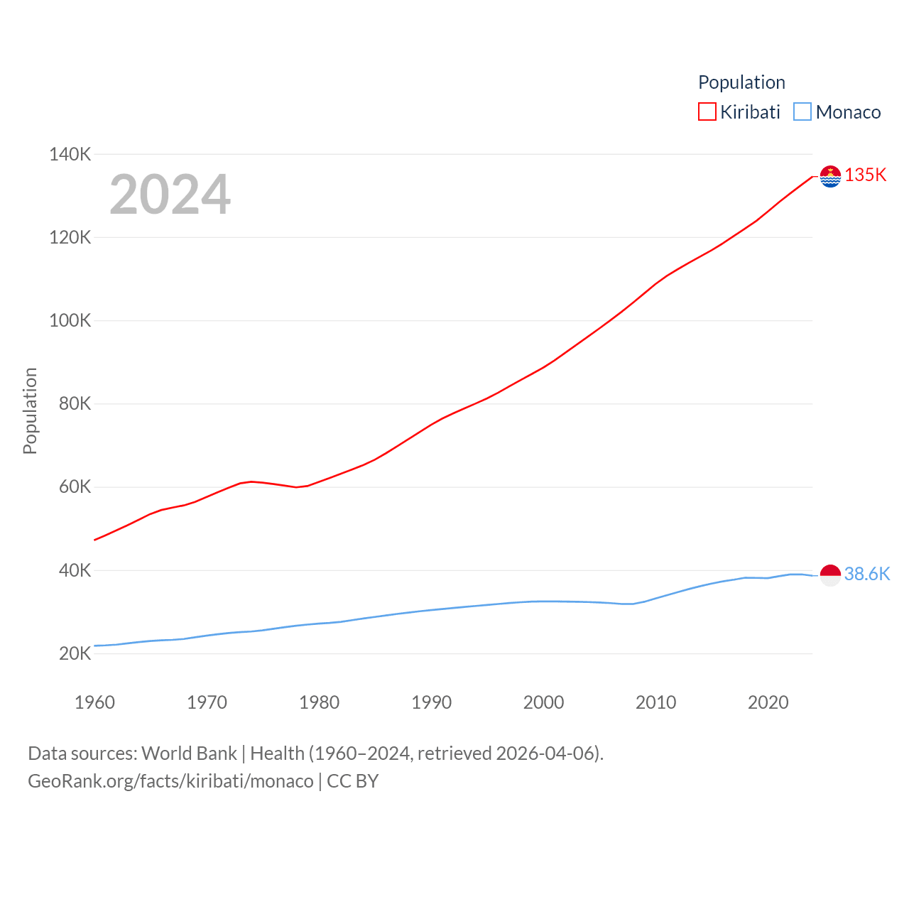 Kiribati has a population of 135K (ranked 180/197), compared with 38.6K in Monaco (ranked 191/197). Kiribati's land area is 313 sq mi versus 0.8 sq mi for Monaco (ranked 173rd vs. 196th).