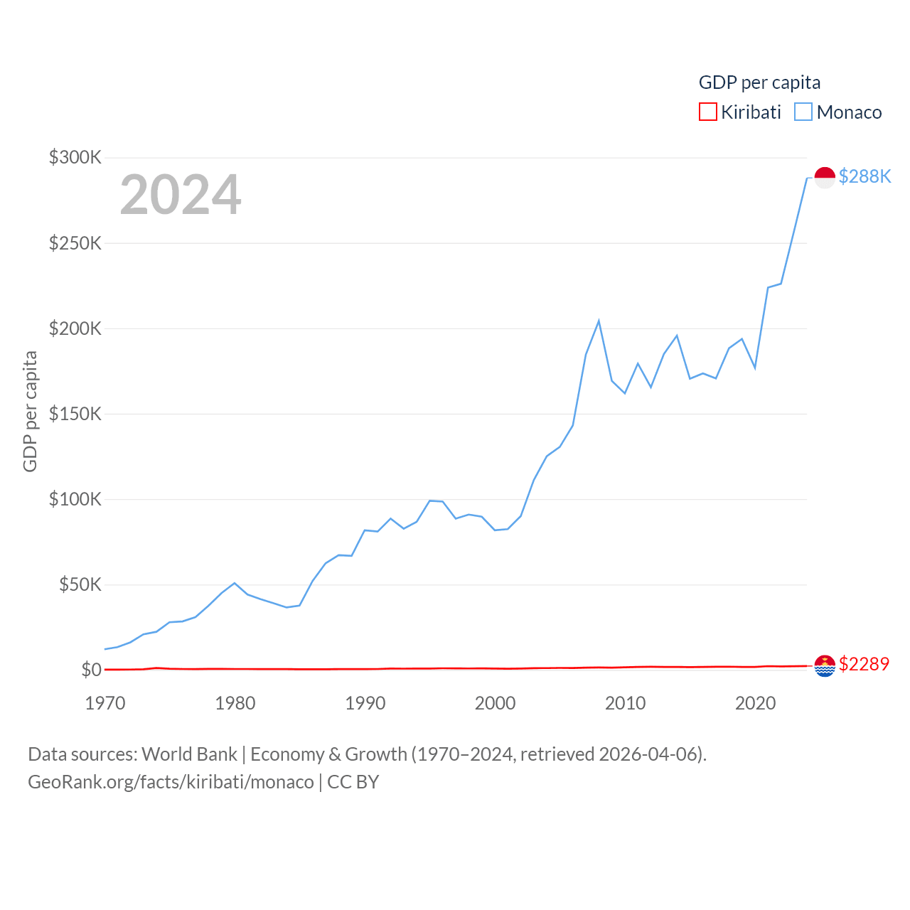 By GDP, Kiribati ranks 192/197 ($308M) and Monaco ranks 152/197 ($11.1B). By GDP per capita, Kiribati ranks 152/197 ($2,289), while Monaco ranks 1/197 ($288,001).
