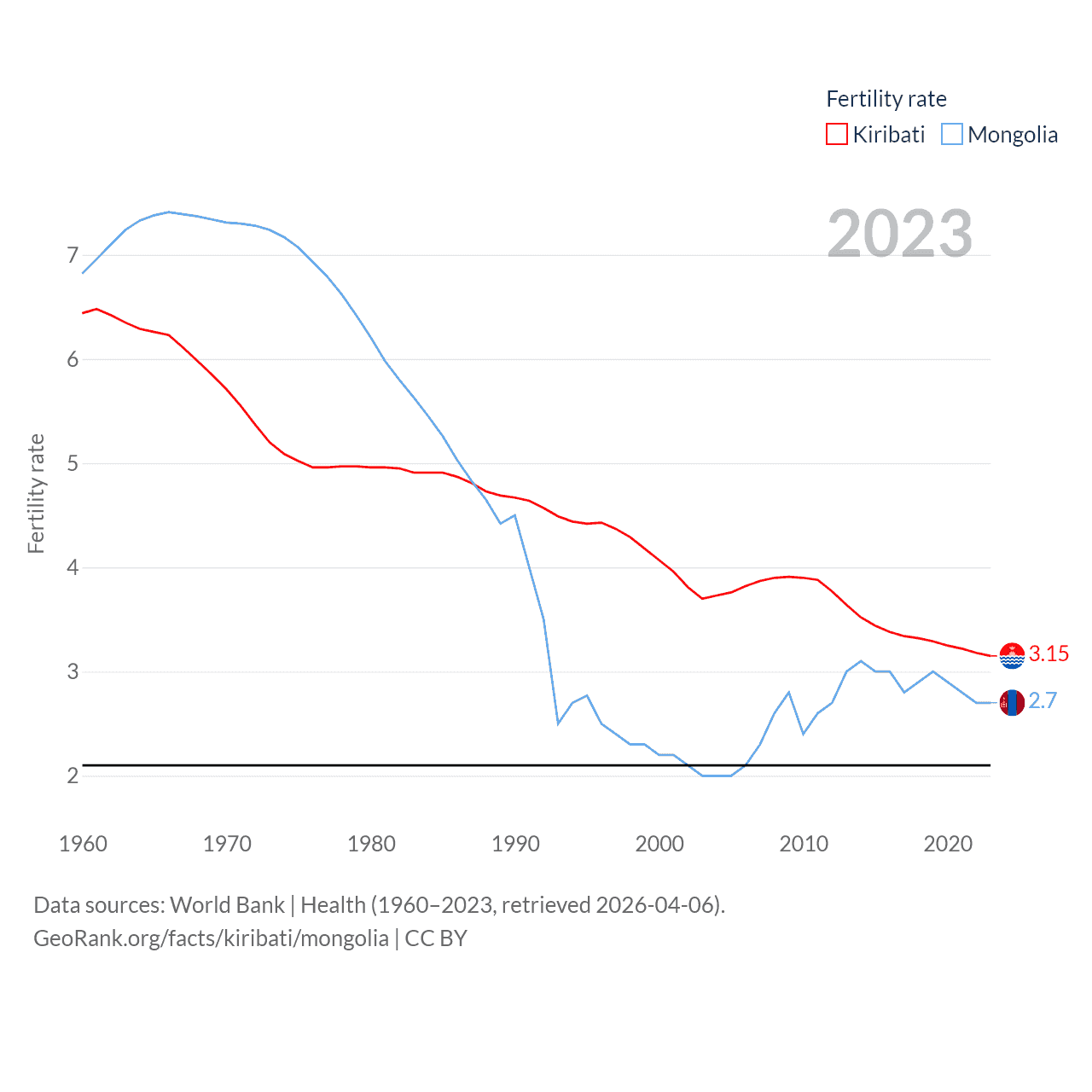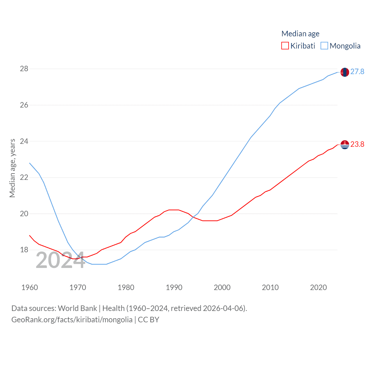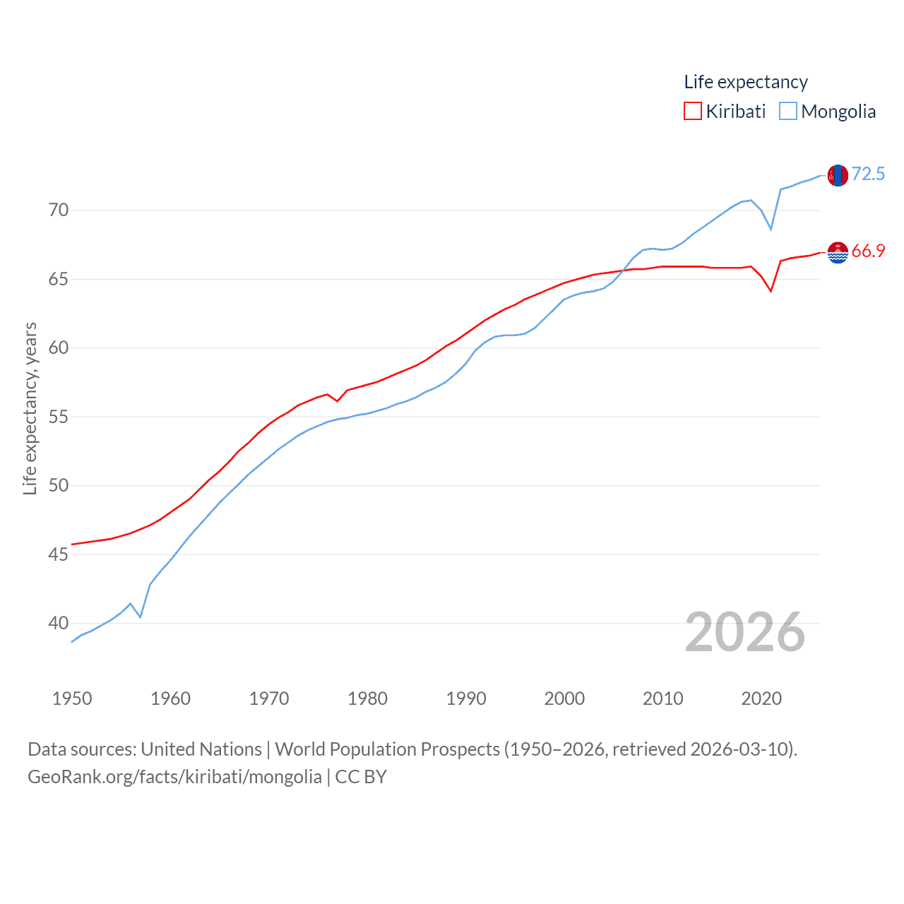 Kiribati has a population of 135K (ranked 180/197), compared with 3.52M in Mongolia (ranked 132/197). Kiribati's land area is 313 sq mi versus 601,740 sq mi for Mongolia (ranked 173rd vs. 18th).