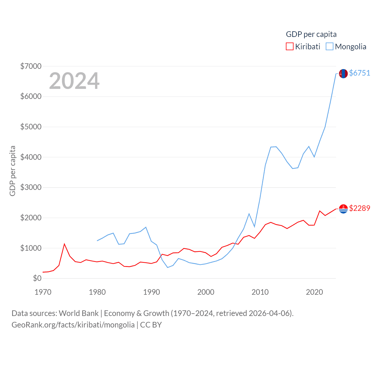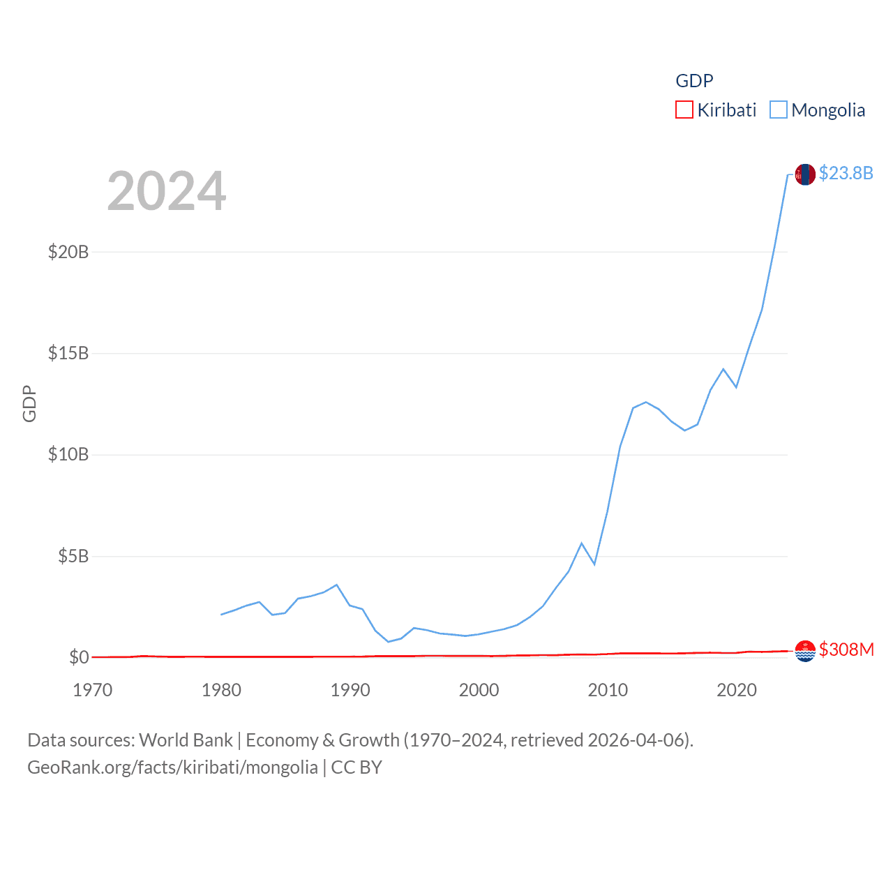 By GDP, Kiribati ranks 192/197 ($308M) and Mongolia ranks 121/197 ($23.8B). By GDP per capita, Kiribati ranks 152/197 ($2,289), while Mongolia ranks 105/197 ($6,751).