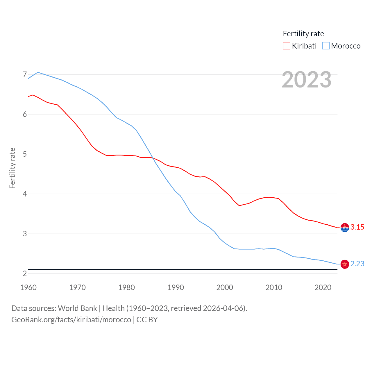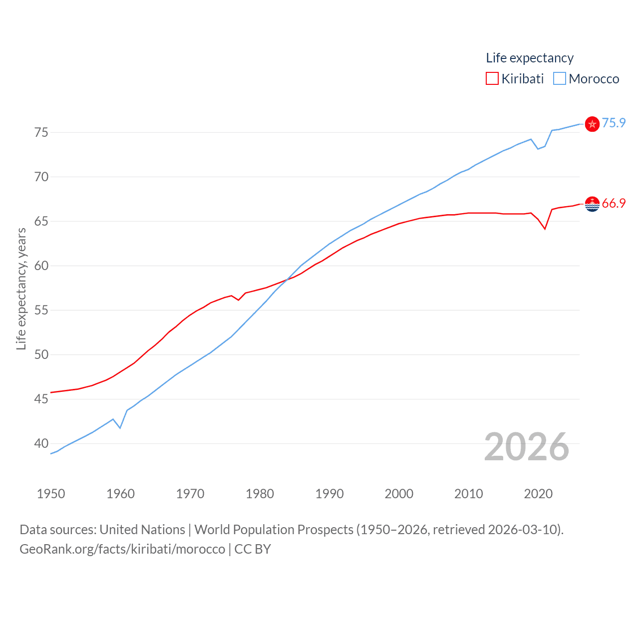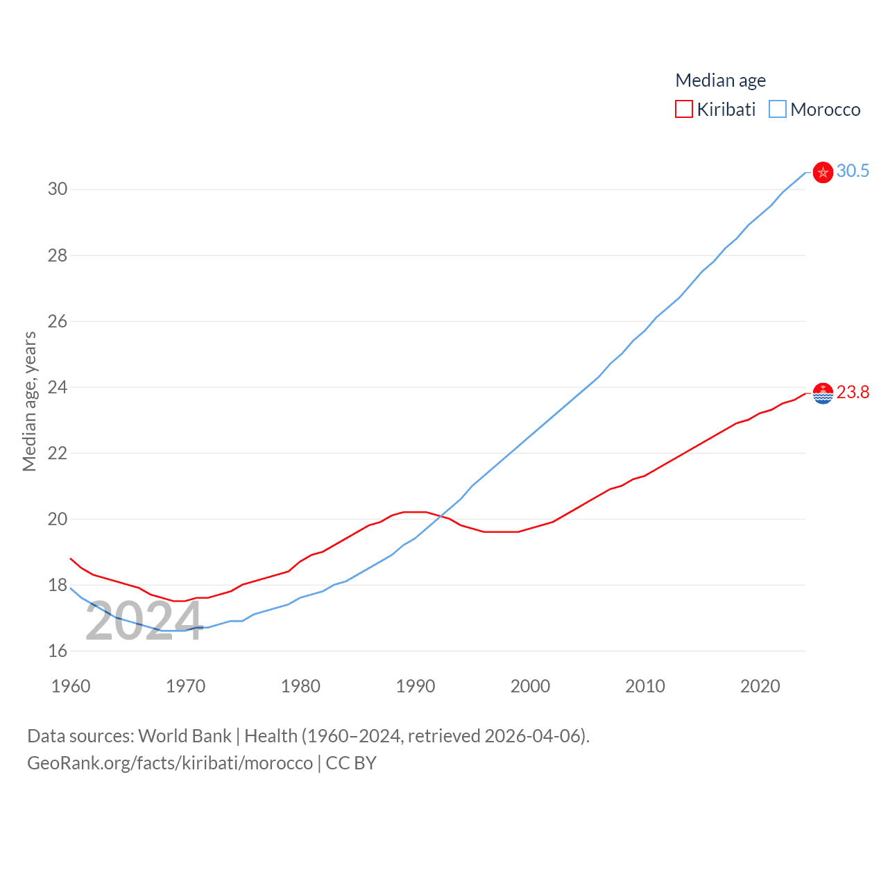 Kiribati has a population of 135K (ranked 180/197), compared with 38.1M in Morocco (ranked 39/197). Kiribati's land area is 313 sq mi versus 172,317 sq mi for Morocco (ranked 173rd vs. 55th).