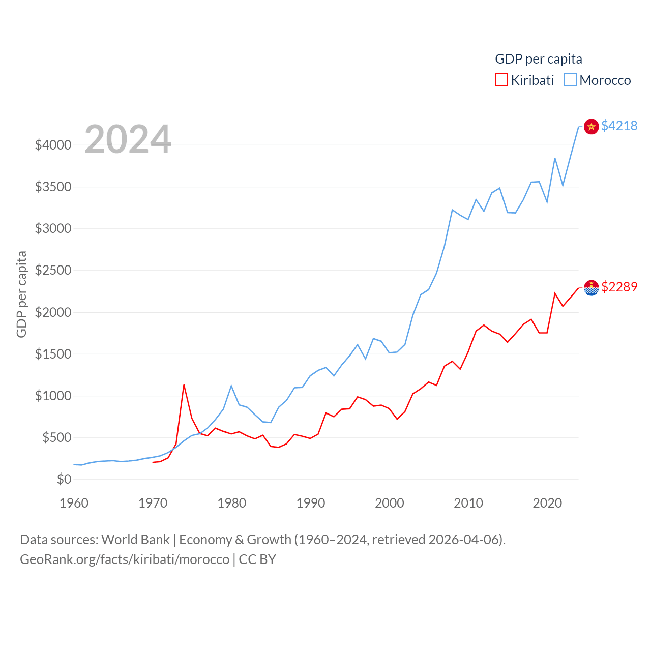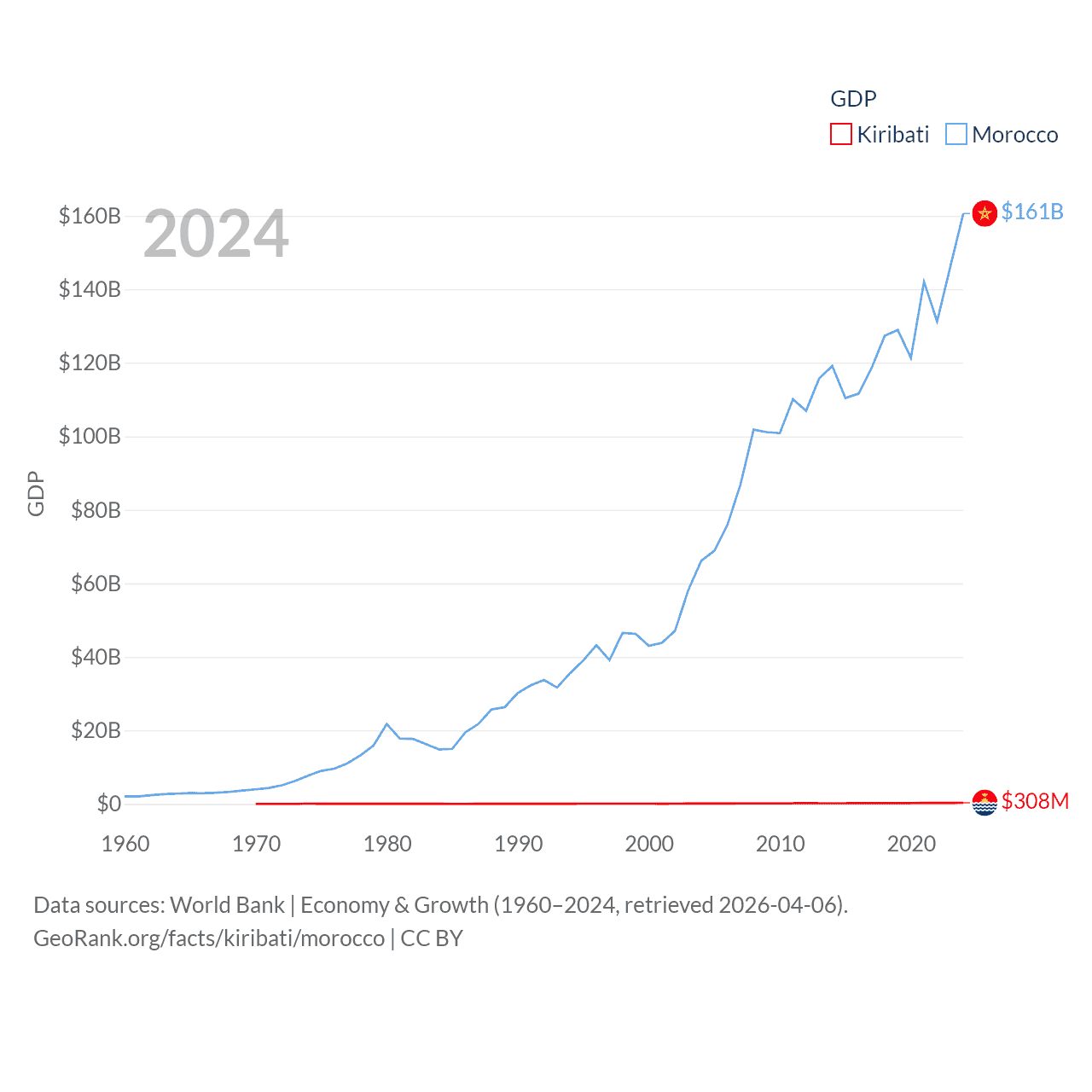 By GDP, Kiribati ranks 192/197 ($308M) and Morocco ranks 58/197 ($161B). By GDP per capita, Kiribati ranks 152/197 ($2,289), while Morocco ranks 127/197 ($4,218).