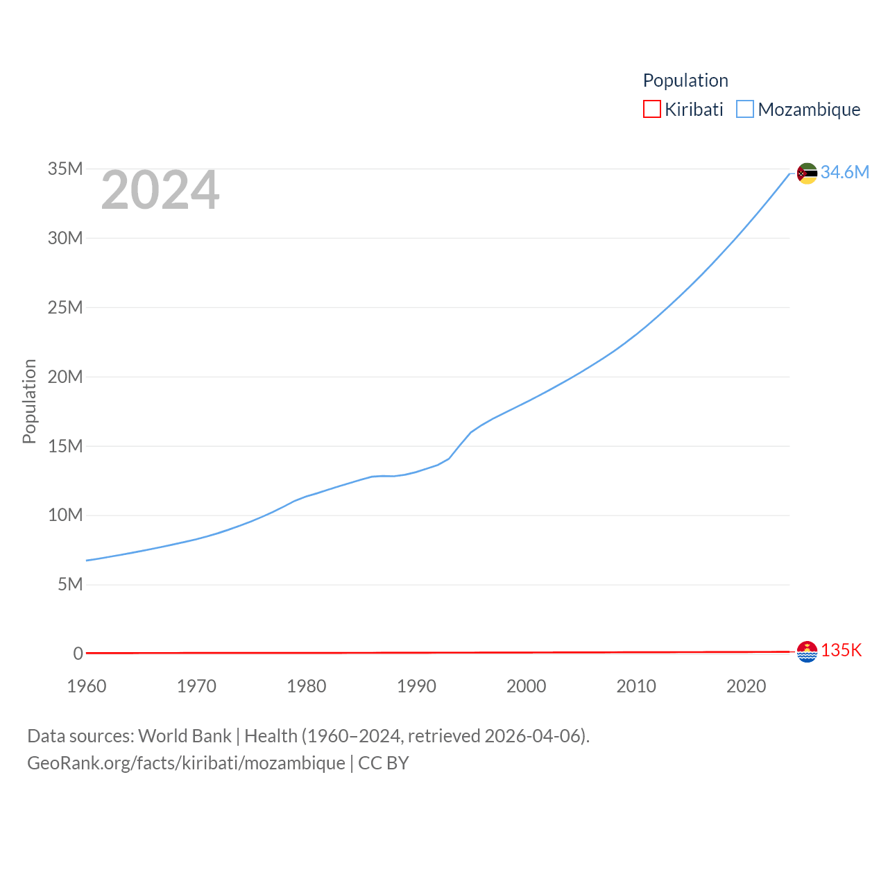 Kiribati has a population of 135K (ranked 180/197), compared with 34.6M in Mozambique (ranked 46/197). Kiribati's land area is 313 sq mi versus 303,623 sq mi for Mozambique (ranked 173rd vs. 34th).