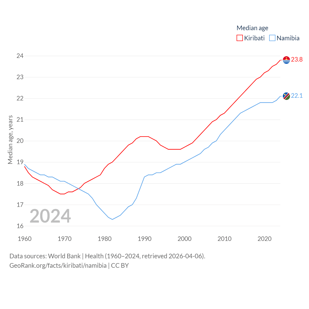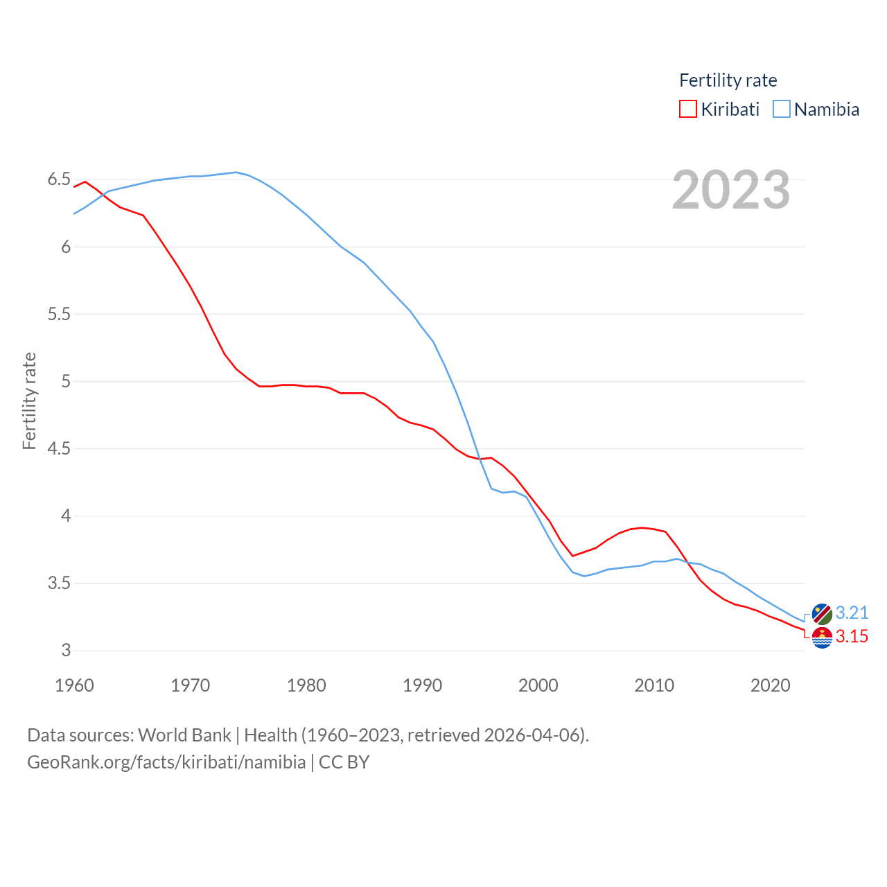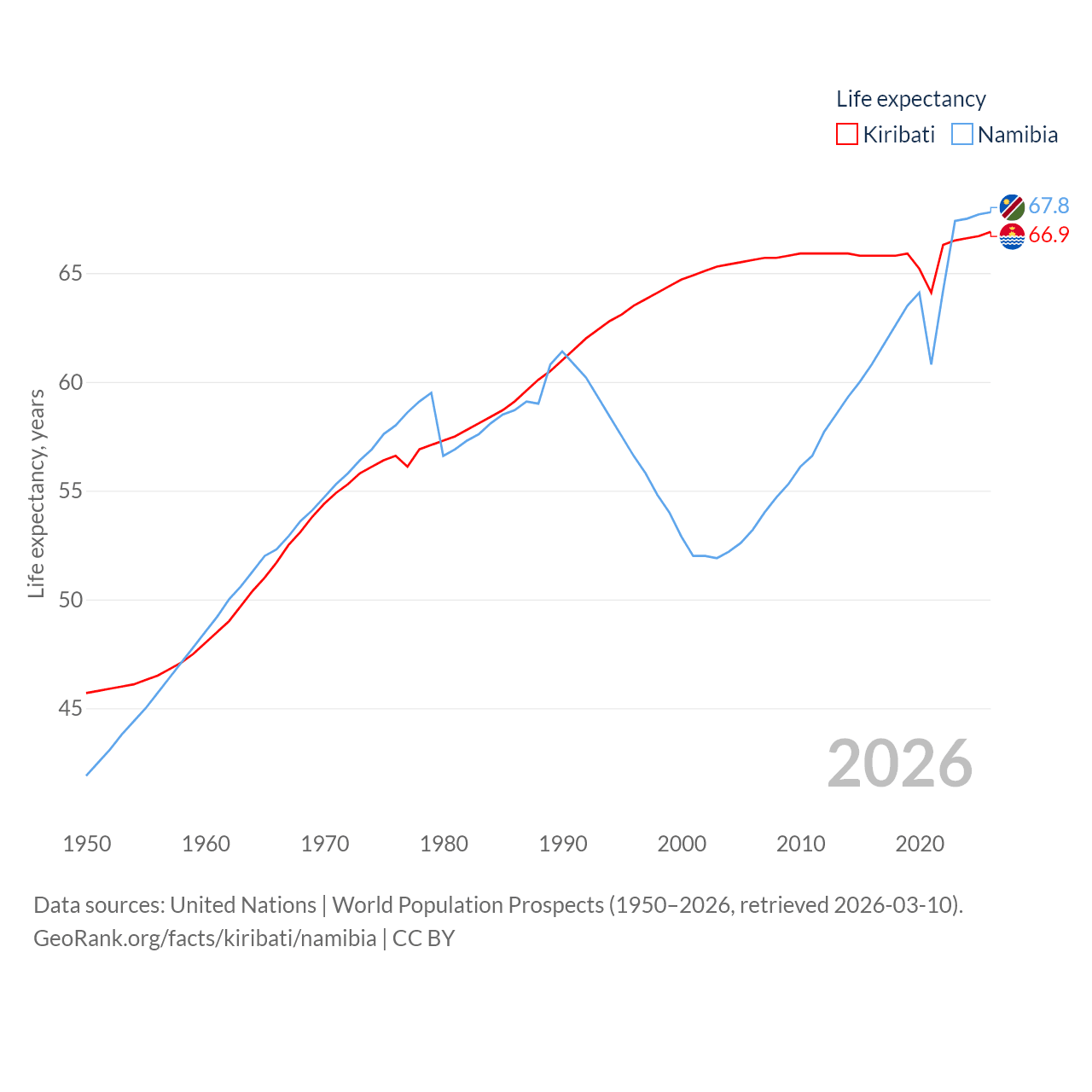 Kiribati has a population of 135K (ranked 180/197), compared with 3.03M in Namibia (ranked 136/197). Kiribati's land area is 313 sq mi versus 317,874 sq mi for Namibia (ranked 173rd vs. 33rd).