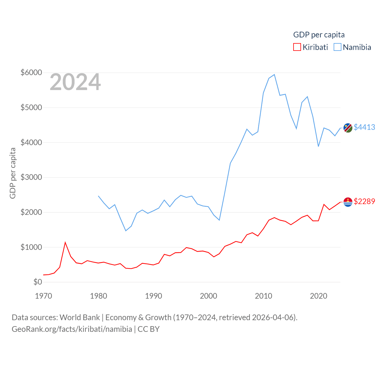 By GDP, Kiribati ranks 192/197 ($308M) and Namibia ranks 147/197 ($13.4B). By GDP per capita, Kiribati ranks 152/197 ($2,289), while Namibia ranks 126/197 ($4,413).