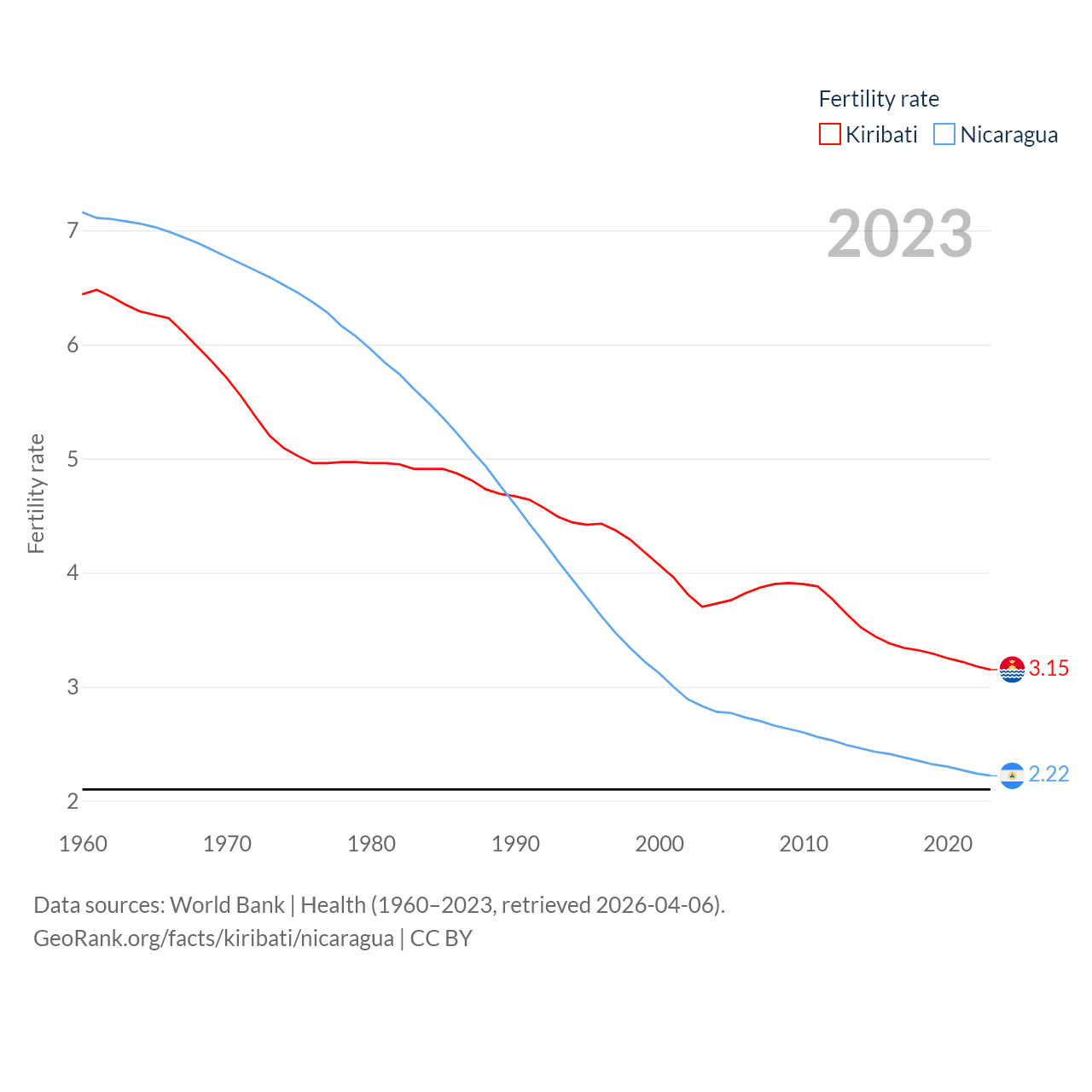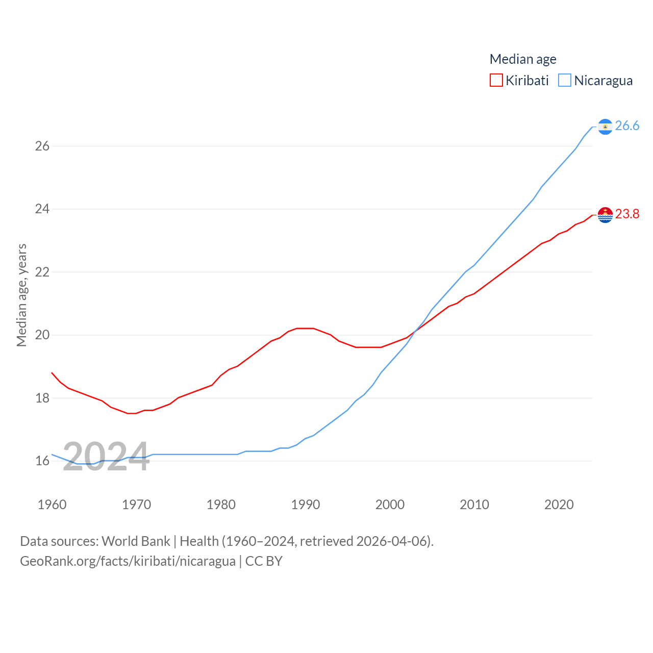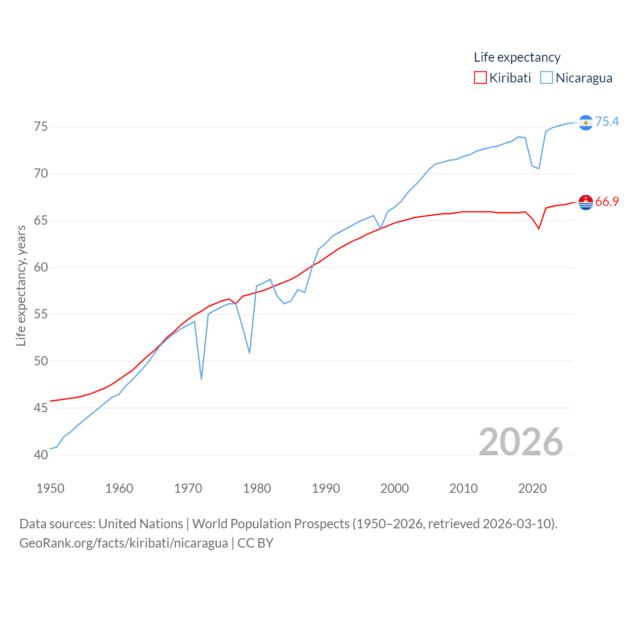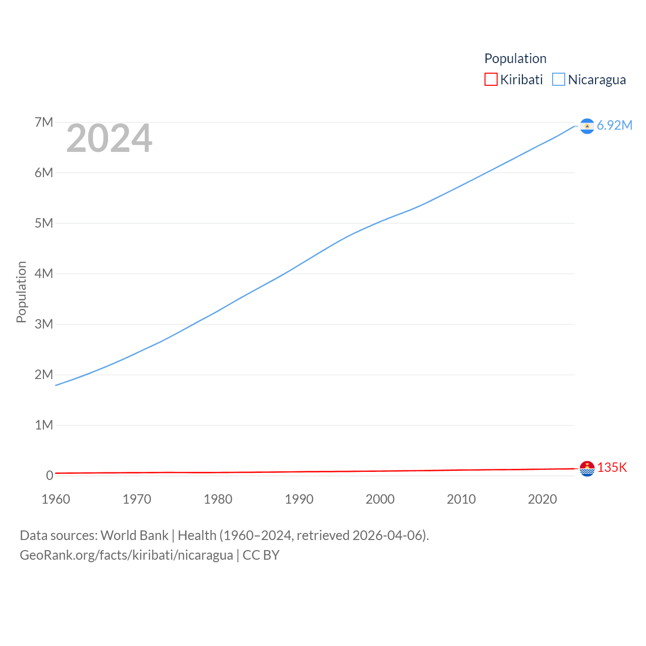 Kiribati has a population of 135K (ranked 180/197), compared with 6.92M in Nicaragua (ranked 108/197). Kiribati's land area is 313 sq mi versus 46,464 sq mi for Nicaragua (ranked 173rd vs. 98th).