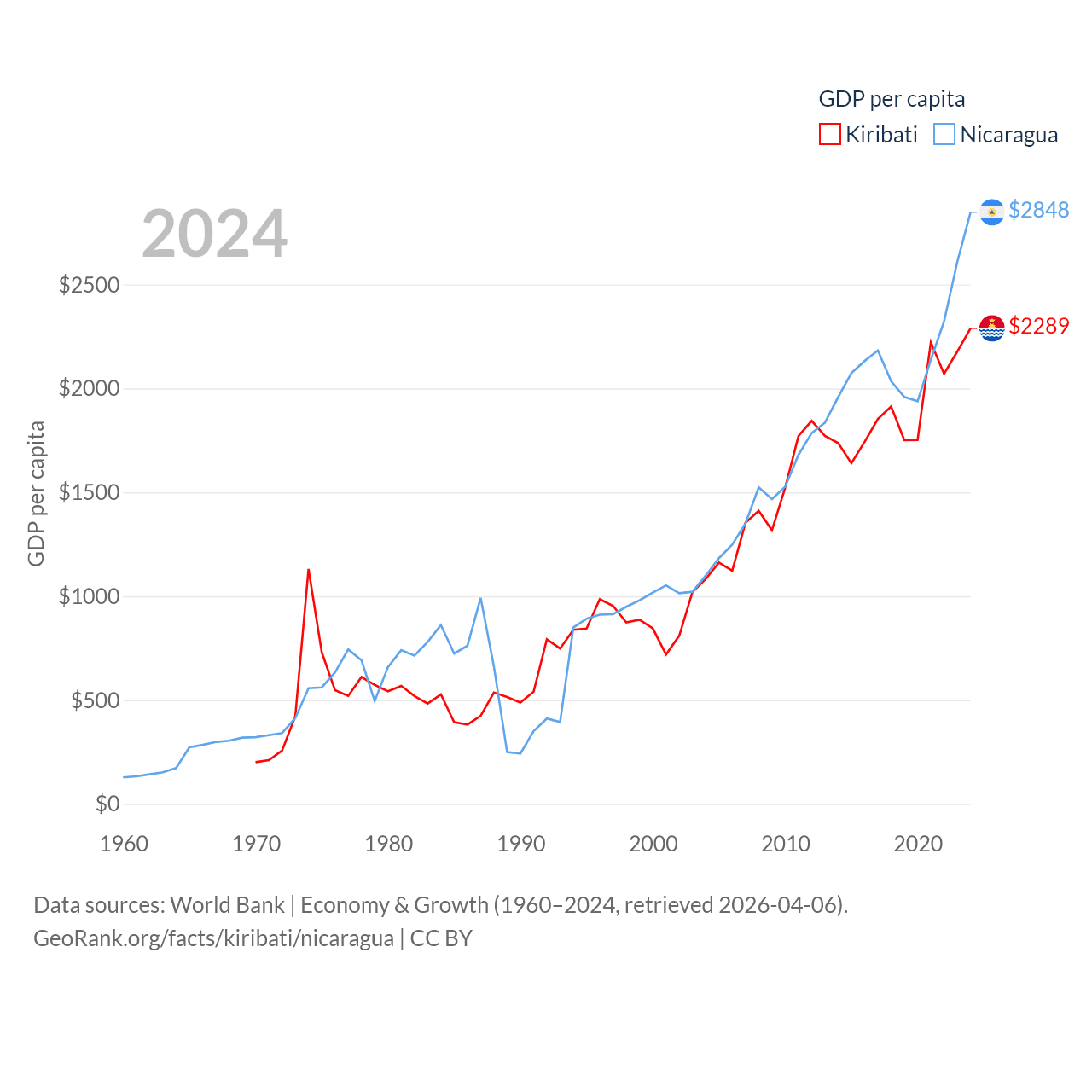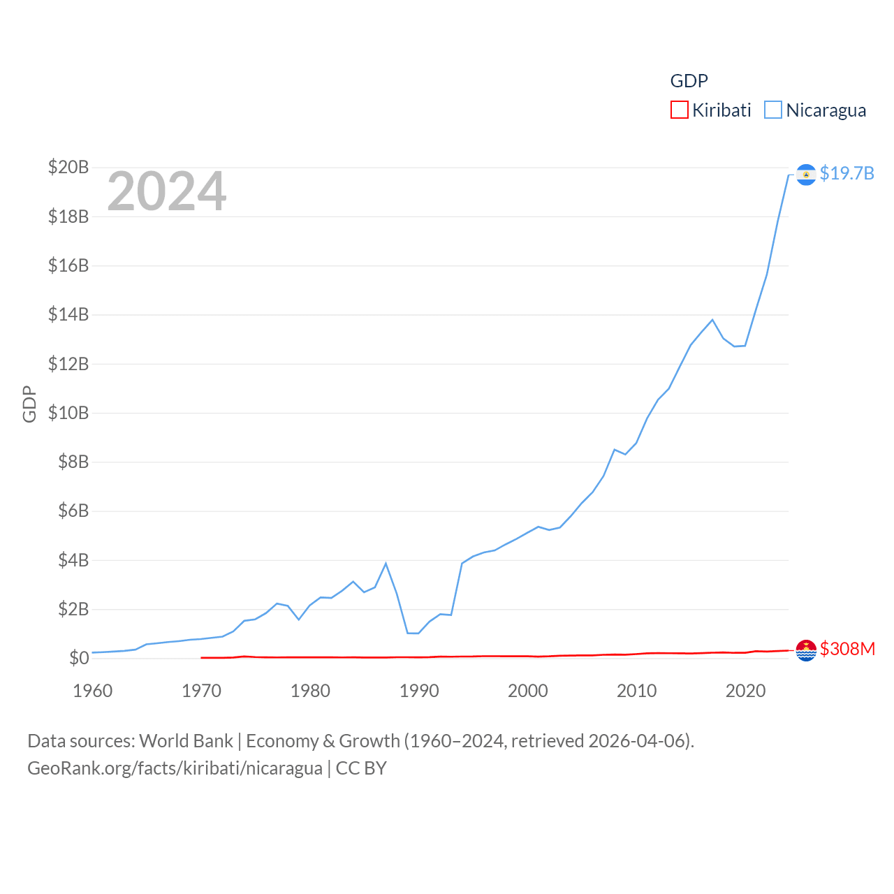 By GDP, Kiribati ranks 192/197 ($308M) and Nicaragua ranks 131/197 ($19.7B). By GDP per capita, Kiribati ranks 152/197 ($2,289), while Nicaragua ranks 141/197 ($2,848).