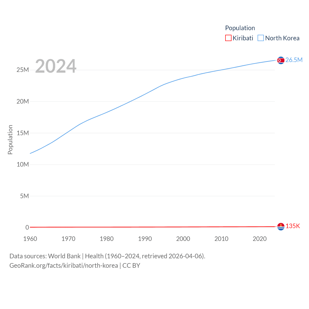 Kiribati has a population of 135K (ranked 180/197), compared with 26.5M in North Korea (ranked 56/197). Kiribati's land area is 313 sq mi versus 46,491 sq mi for North Korea (ranked 173rd vs. 97th).