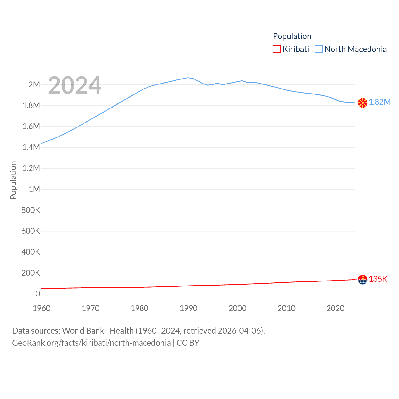 Kiribati has a population of 135K (ranked 180/197), compared with 1.82M in North Macedonia (ranked 150/197). Kiribati's land area is 313 sq mi versus 9,737 sq mi for North Macedonia (ranked 173rd vs. 145th).