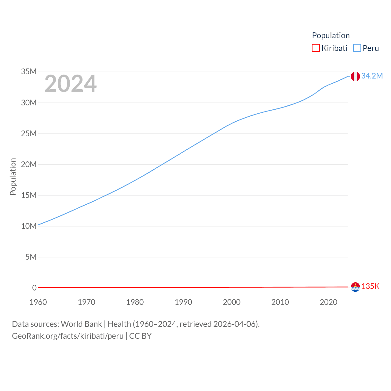 Kiribati has a population of 135K (ranked 180/197), compared with 34.2M in Peru (ranked 48/197). Kiribati's land area is 313 sq mi versus 494,211 sq mi for Peru (ranked 173rd vs. 19th).