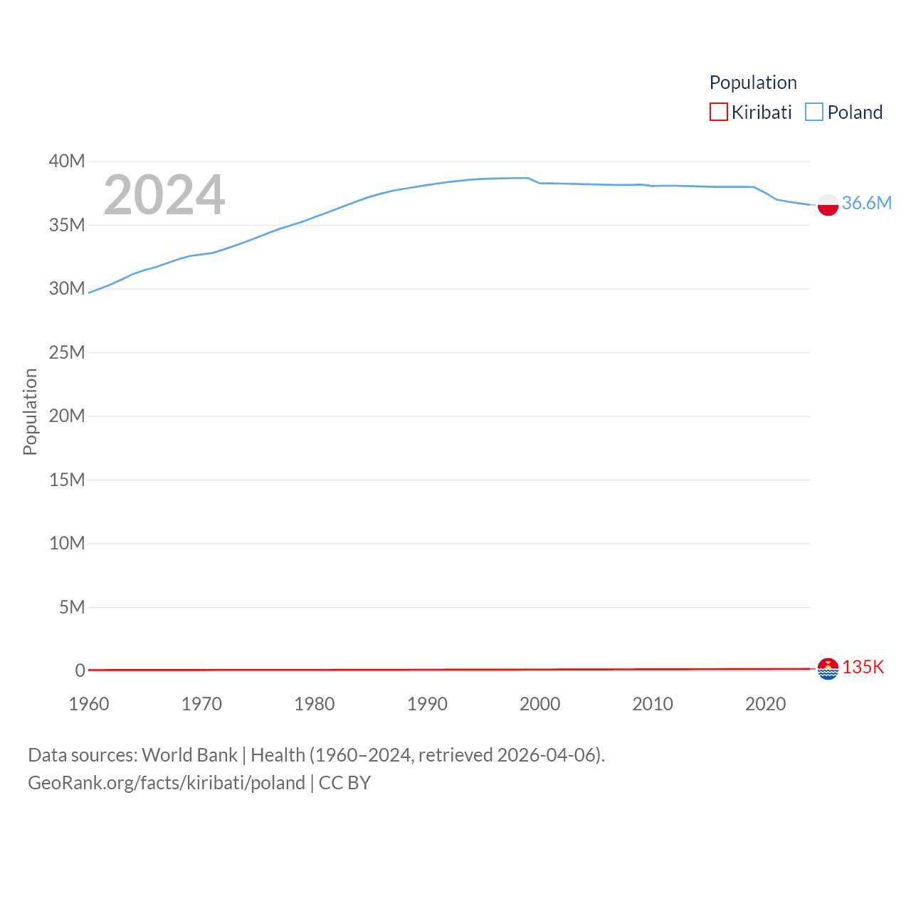 Kiribati has a population of 135K (ranked 180/197), compared with 36.6M in Poland (ranked 42/197). Kiribati's land area is 313 sq mi versus 118,252 sq mi for Poland (ranked 173rd vs. 69th).
