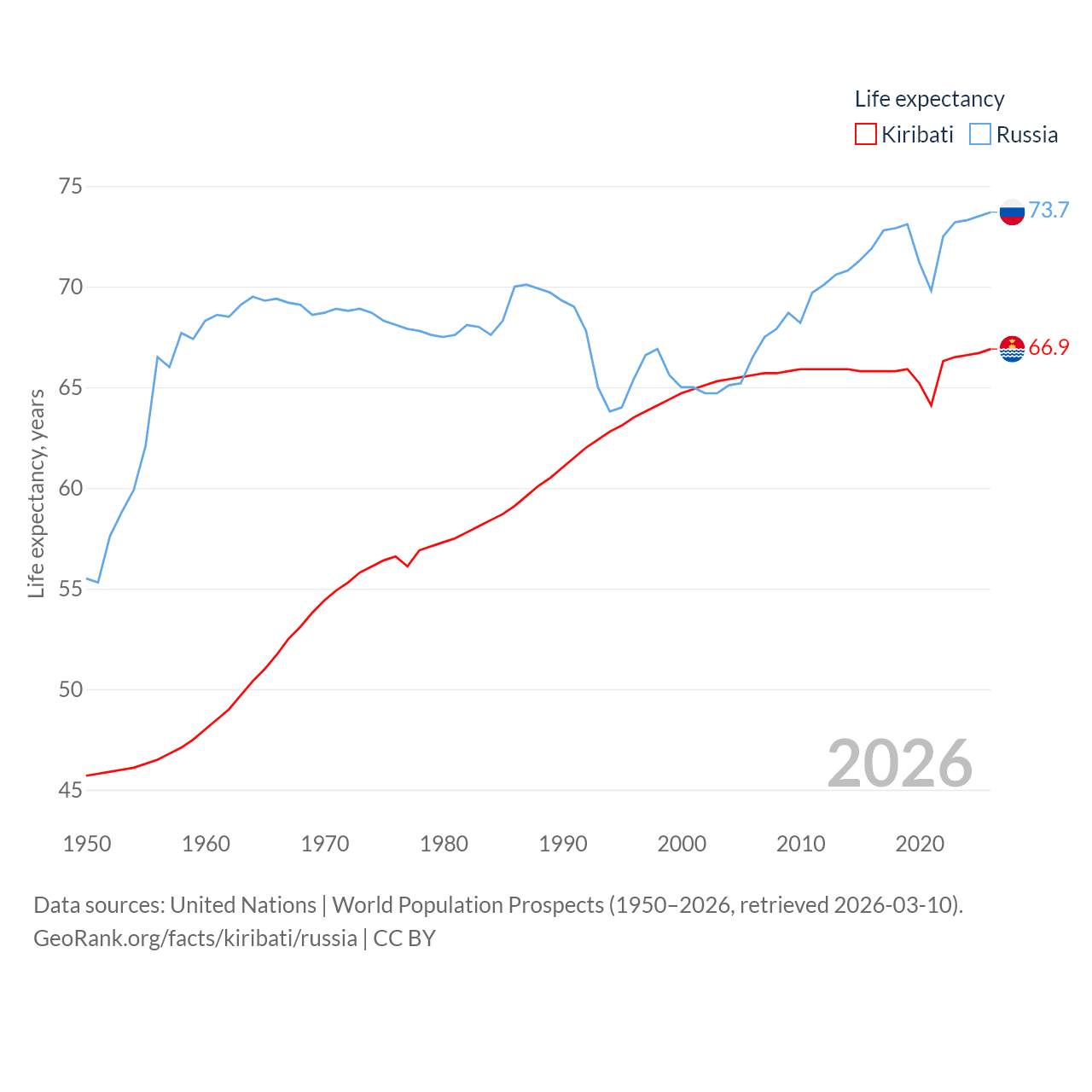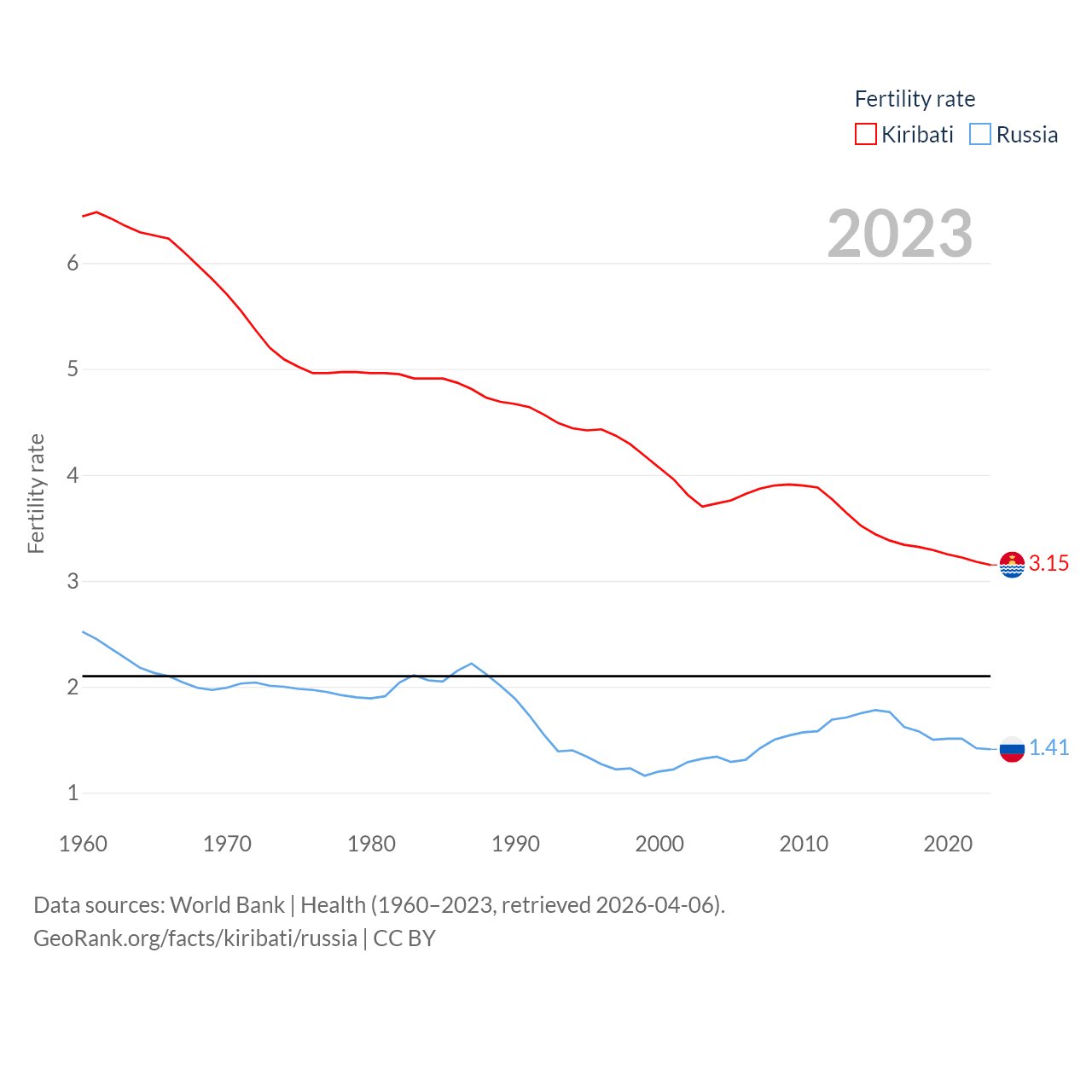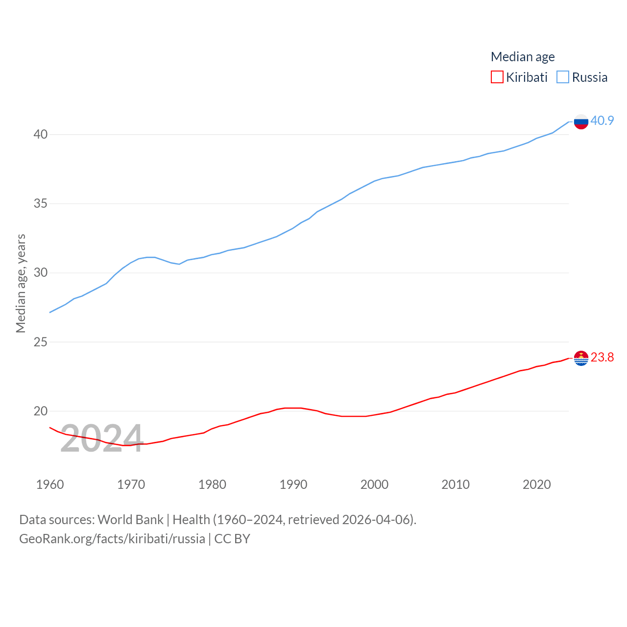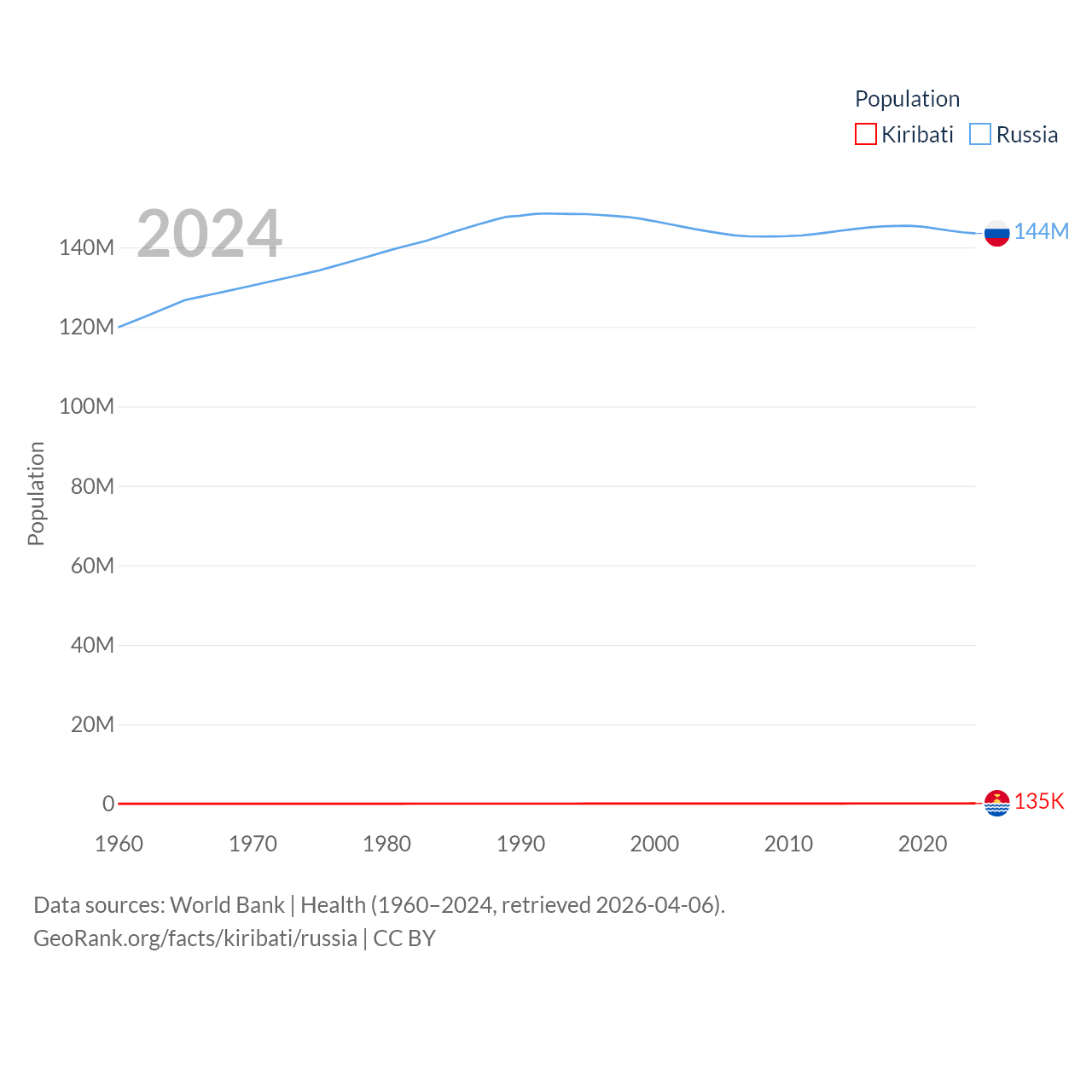 Kiribati has a population of 135K (ranked 180/197), compared with 144M in Russia (ranked 9/197). Kiribati's land area is 313 sq mi versus 6,323,145 sq mi for Russia (ranked 173rd vs. 1st).