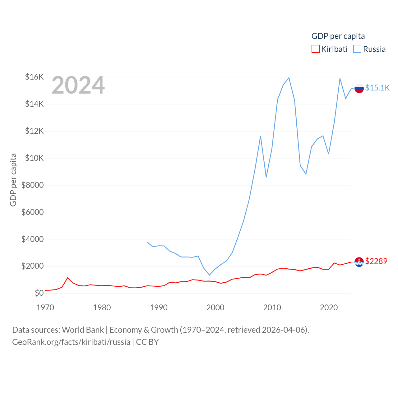 By GDP, Kiribati ranks 192/197 ($308M) and Russia ranks 11/197 ($2.17T). By GDP per capita, Kiribati ranks 152/197 ($2,289), while Russia ranks 68/197 ($15,145).