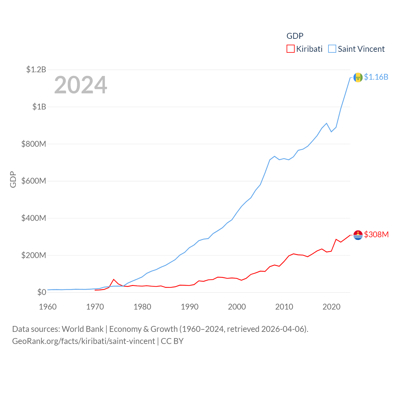 By GDP, Kiribati ranks 192/197 ($308M) and Saint Vincent ranks 186/197 ($1.16B). By GDP per capita, Kiribati ranks 152/197 ($2,289), while Saint Vincent ranks 81/197 ($11,501).