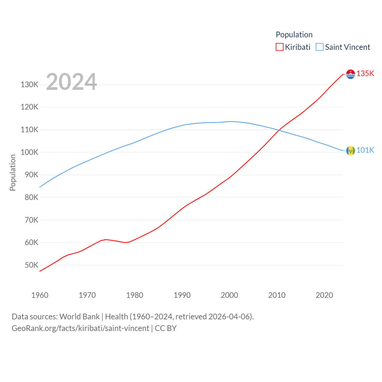 Kiribati has a population of 135K (ranked 180/197), compared with 101K in Saint Vincent (ranked 184/197). Kiribati's land area is 313 sq mi versus 150.6 sq mi for Saint Vincent (ranked 173rd vs. 185th).