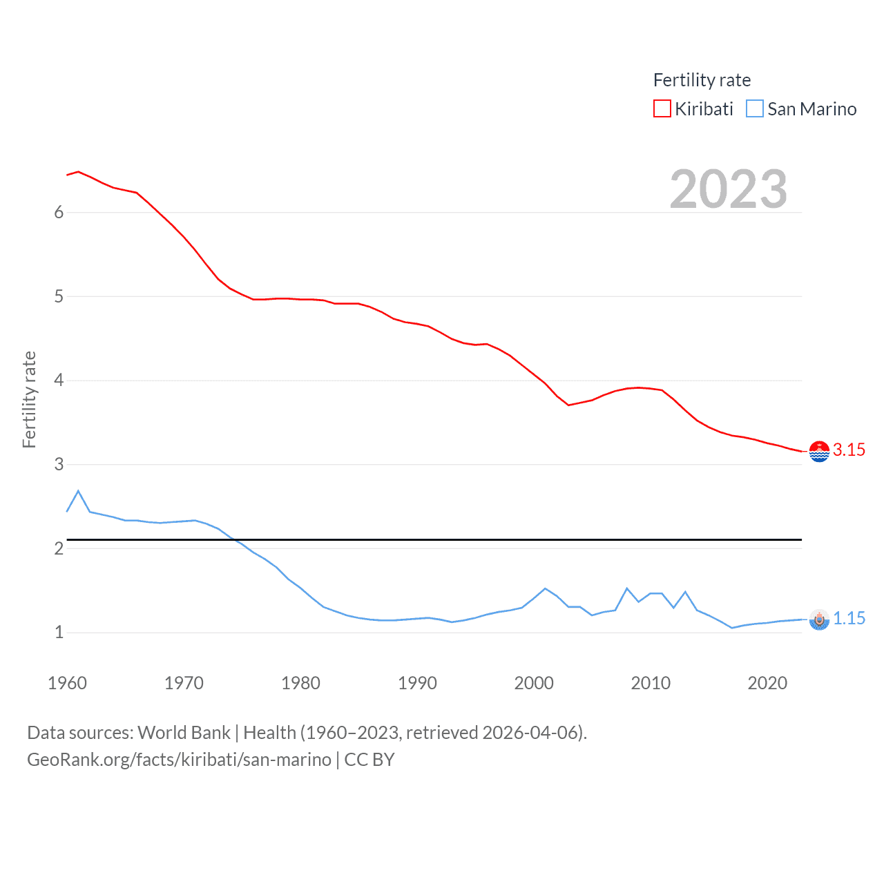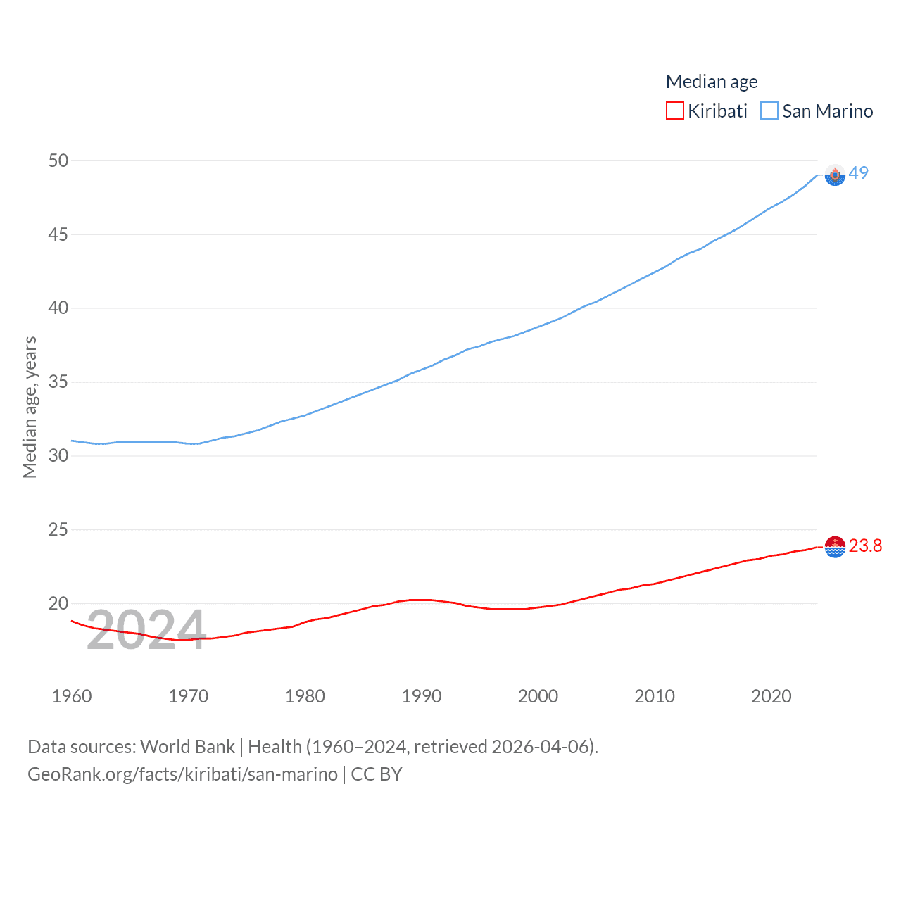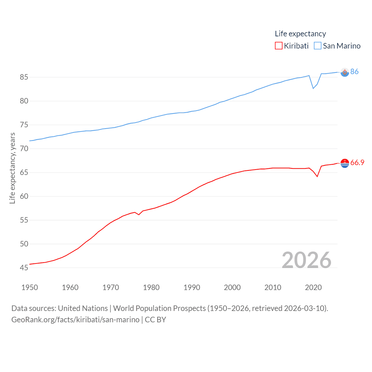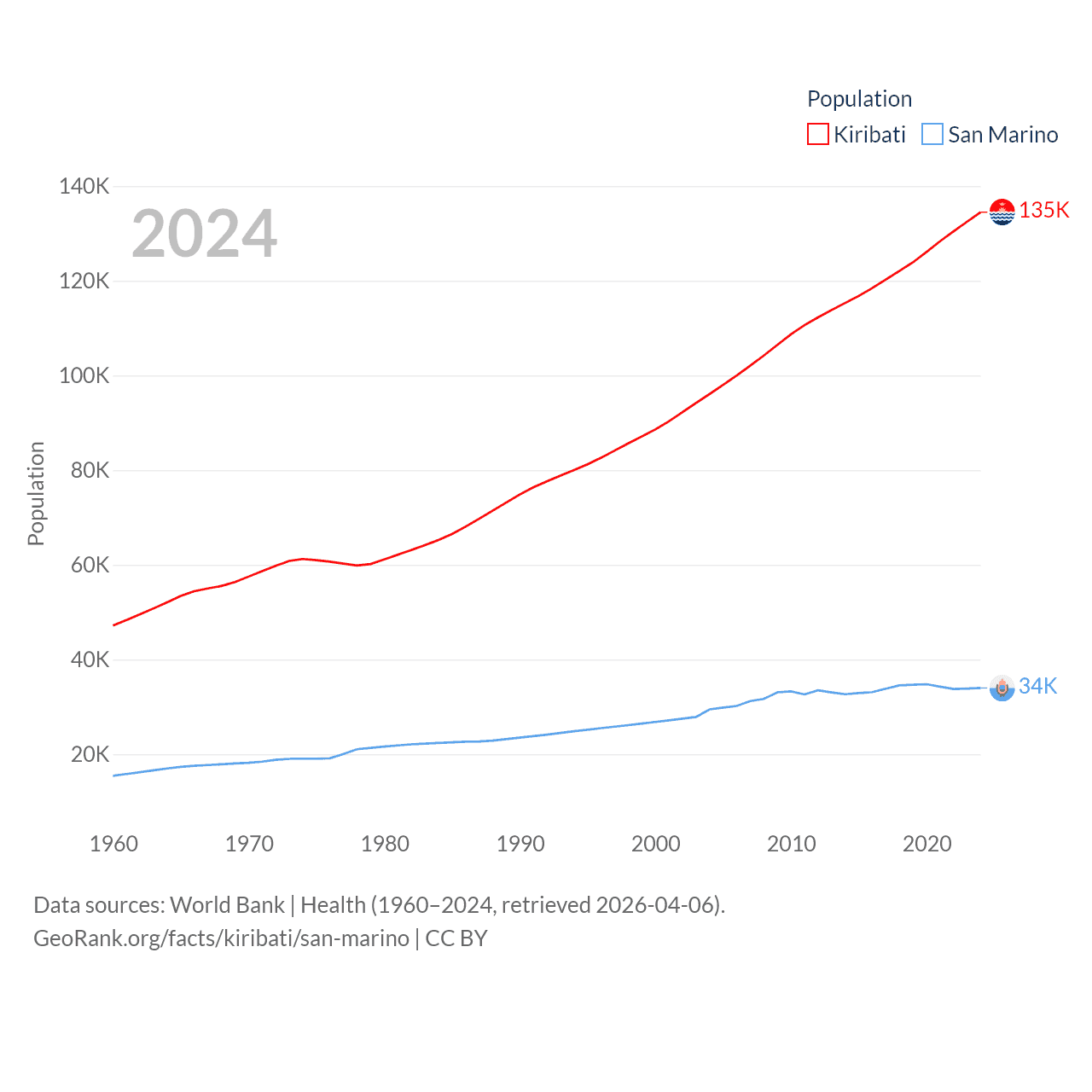Kiribati has a population of 135K (ranked 180/197), compared with 34K in San Marino (ranked 193/197). Kiribati's land area is 313 sq mi versus 23.2 sq mi for San Marino (ranked 173rd vs. 193rd).