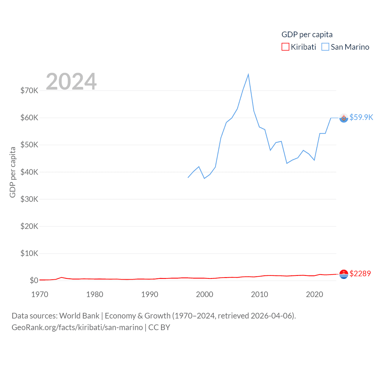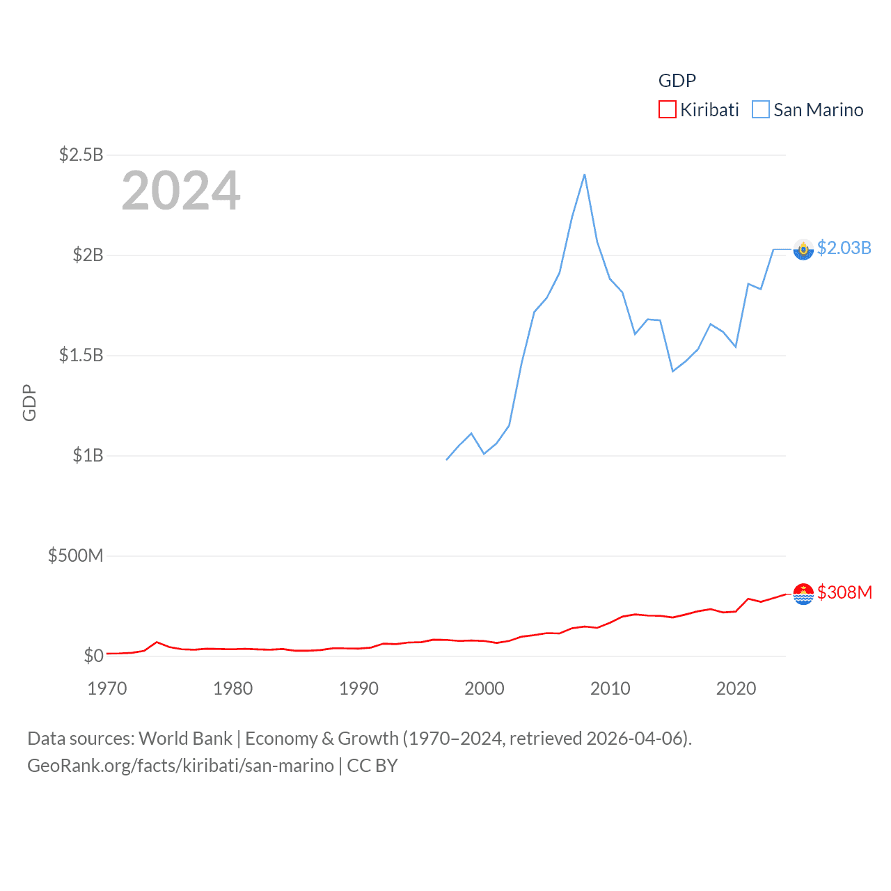 By GDP, Kiribati ranks 192/197 ($308M) and San Marino ranks 180/197 ($2.03B). By GDP per capita, Kiribati ranks 152/197 ($2,289), while San Marino ranks 15/197 ($59,880).