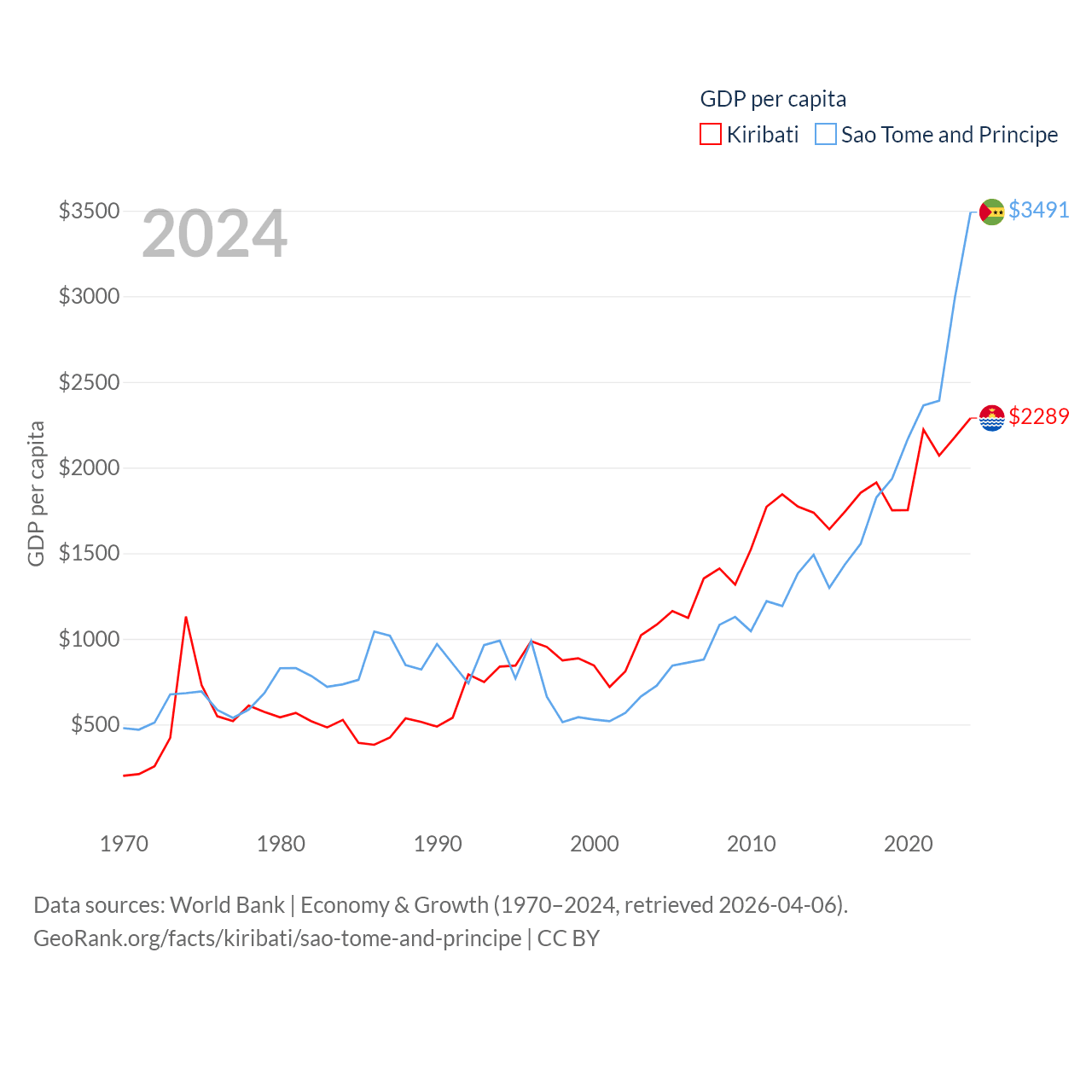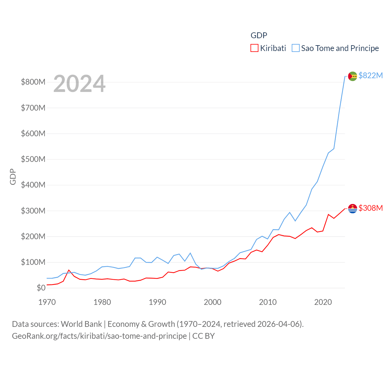 By GDP, Kiribati ranks 192/197 ($308M) and Sao Tome and Principe ranks 189/197 ($822M). By GDP per capita, Kiribati ranks 152/197 ($2,289), while Sao Tome and Principe ranks 134/197 ($3,491).