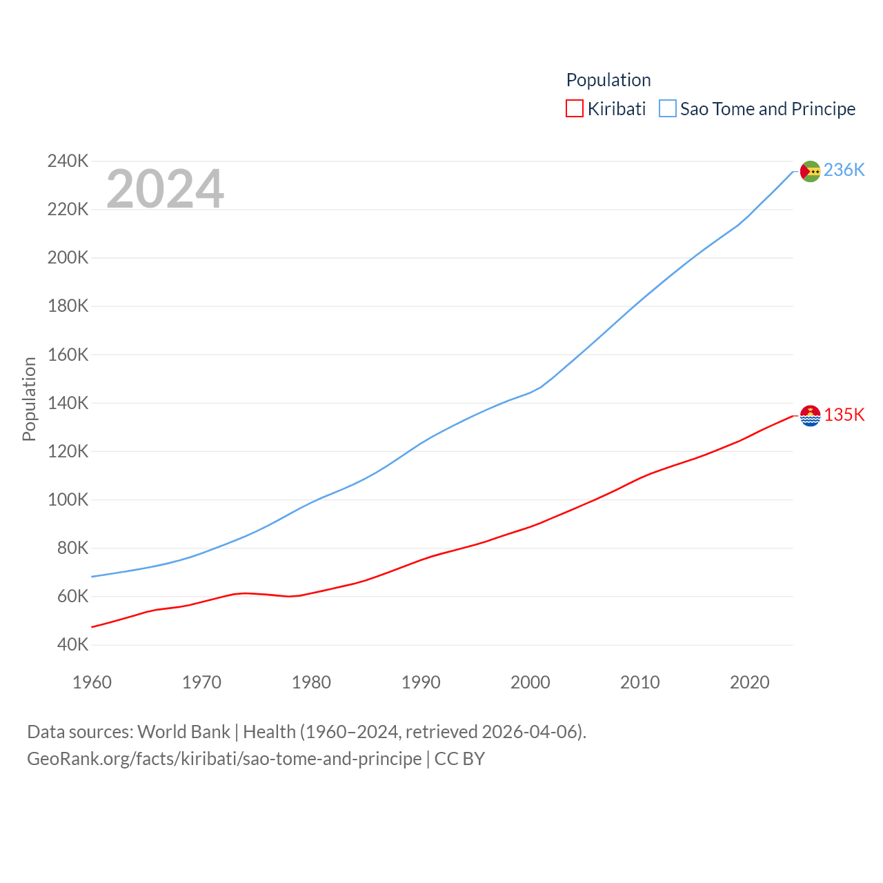 Kiribati has a population of 135K (ranked 180/197), compared with 236K in Sao Tome and Principe (ranked 176/197). Kiribati's land area is 313 sq mi versus 371 sq mi for Sao Tome and Principe (ranked 173rd vs. 172nd).