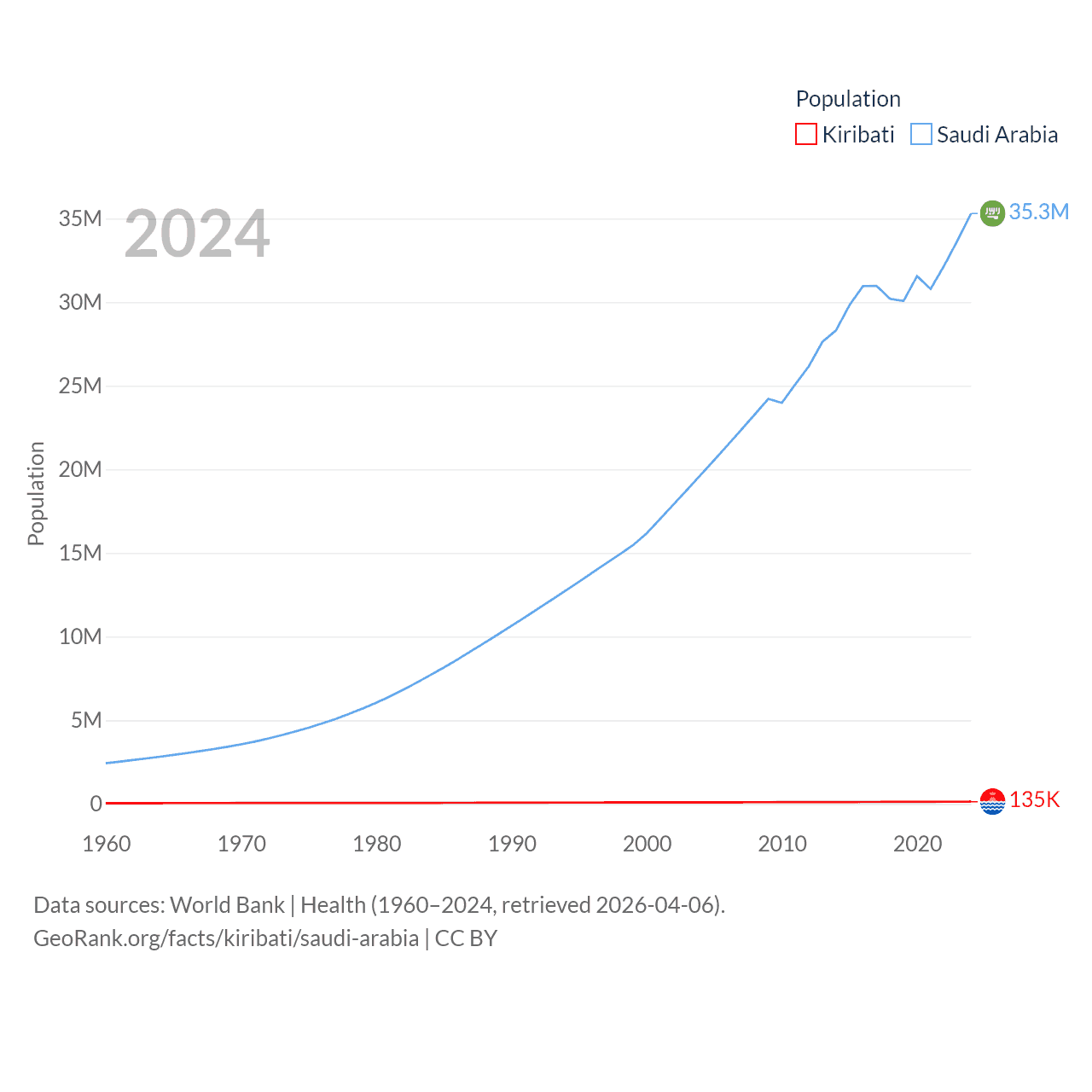Kiribati has a population of 135K (ranked 180/197), compared with 35.3M in Saudi Arabia (ranked 45/197). Kiribati's land area is 313 sq mi versus 830,000 sq mi for Saudi Arabia (ranked 173rd vs. 12th).