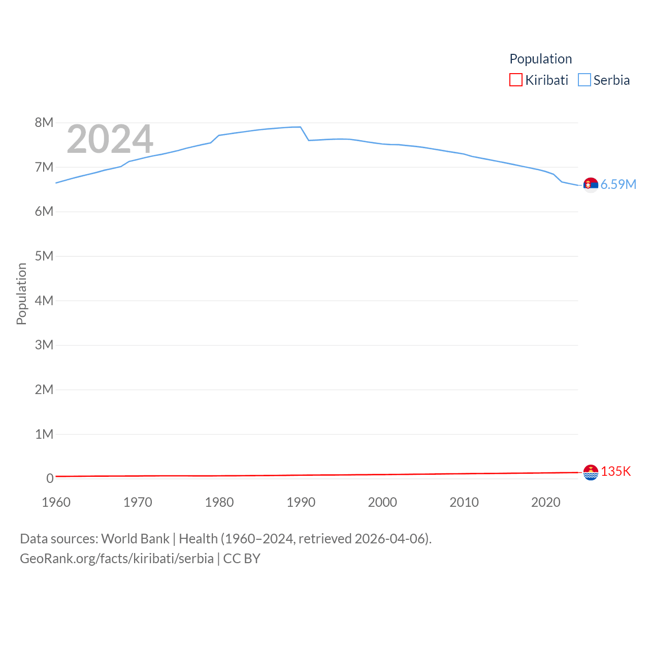 Kiribati has a population of 135K (ranked 180/197), compared with 6.59M in Serbia (ranked 109/197). Kiribati's land area is 313 sq mi versus 32,467 sq mi for Serbia (ranked 173rd vs. 111th).